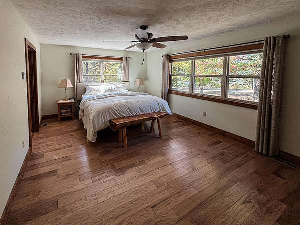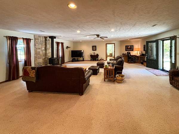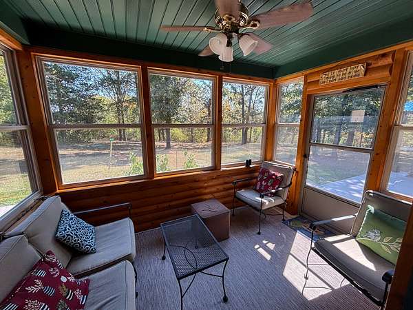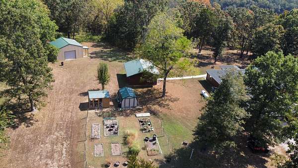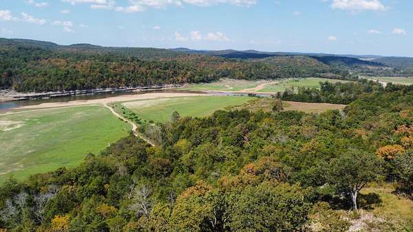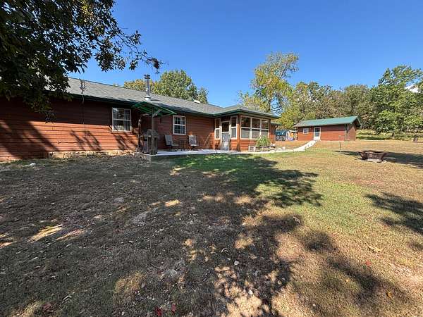 Located at the end of the road and joining the Government Take Line on the Big Creek Arm of Bull Shoals Lake in Taney County, Missouri, this package deal includes a lovely home, outbuildings (including a 2 bed, 1 bath cabin, a neat shop building, a pole barn), and 20 acres of land. The 2 bed, 2.5 bath home has over 2000 sq. ft. of living space plus an additional 622 sq. ft. in the oversized garage and mechanical/utility room which is heated and cooled with a separate mini split. The home had a new HVAC system installed in July of this year. A new roof, rain gutters, and leaf guards were installed 1 year ago. The living room has lots of room for entertaining in itself and flowing directly from the kitchen and dining room, make it appear even larger. The primary ensuite is fantastic! It has a huge walk-in closet and a shower you just have to see to believe. This bedroom has its own HVAC system. Another ensuite is on the opposite end of the home. There are lots of closets and storage areas. A screened in porch and patio off the dining room make the perfect setting for BBQ's with family or friends. Your guests can follow the sidewalk from the house to the 2 bed, 1 bath, cozy little cabin to spend the night. A 24x24 shop is the next building you come to. It is very nice with a 1/2 bath, roll up door, and its own mini split. Also in the big yard is a pole barn and storage shed.Down the hill from the house, a bench has been set up overlooking the pond that makes for a good place to rest and enjoy watching all the wildlife early morning or late afternoon. The property adjoins the Corps for over 1/2 mile. Access to the lake is great. Come and play! PRIVATE...PRIVATE...PRIVATE