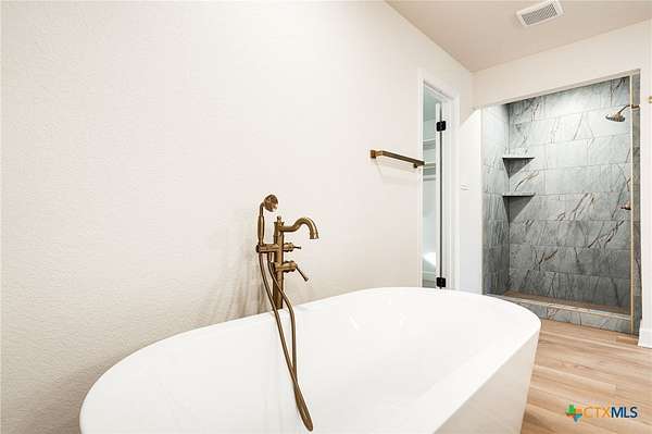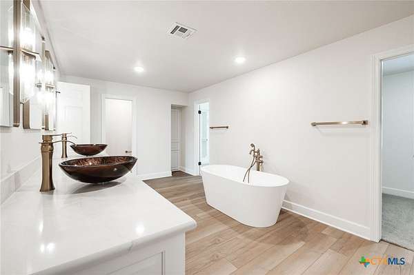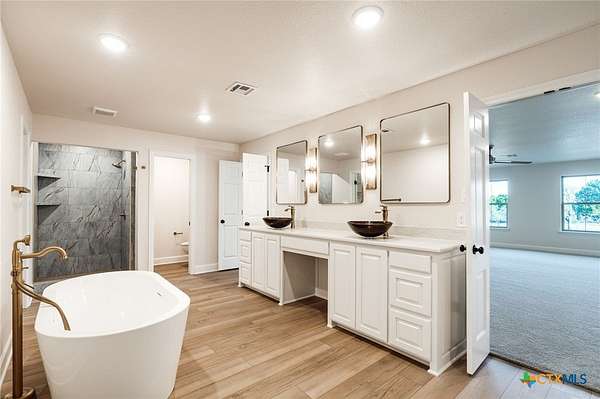 Exquisite Estate on Over 5 Acres where Modern Luxury Meets Stately Elegance. Step into timeless sophistication in this stunning home, perfectly blending modern updates with classic elegance. Situated on more than 5 acres, this 6,000+ sf home exudes character and luxury at every turn. The main level features formal living and dining rooms, a large family room/den with fireplace, and a modern kitchen with breakfast area designed for both function and style. A full bath and powder room are also on the main floor, alongside a spacious full-sized laundry room with sink and ample cabinetry. The home boasts two primary suites, including a grand downstairs primary with separate dressing areas, closets and vanities, shower and tub/shower, private access to both front and back yards, coffered wall accents and an adjoining game room/office. Upstairs, the second primary suite impresses with dual closets, separate tub and shower, dual vanities, and balcony access. A main guest suite with full bath and two additional guest rooms sharing a full bath ensure comfort for family and visitors alike. Throughout the home, enjoy luxury vinyl plank and plush carpet flooring, fresh paint, updated lighting, modern fixtures, and stainless appliances. Car enthusiasts and hobbyists will appreciate the 3-car attached garage with storage and exterior access, plus a detached 2-door garage offering additional storage. Outdoors, the property is fully fenced, including a cross-fenced area in back. Don't miss this rare opportunity to own a piece of Gatesville history while enjoying all the modern comforts of a meticulously updated luxury estate. Located just 30 minutes from the I35 corridor, this is a must see home!