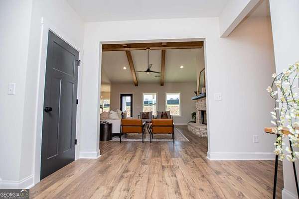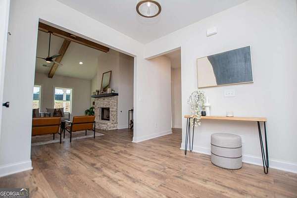 Welcome to this beautiful two-story home perfectly situated on 4.22 private acres, offering the perfect balance of space, comfort, and thoughtful design. This home features Mohawk RevWood flooring throughout the main level common areas along with a hardwood staircase that adds warmth and character. The spacious family room is the heart of the home with vaulted ceilings, exposed beams, and a cozy wood-burning fireplace that helps to create a warm and inviting space to gather. The kitchen is designed for both everyday living and entertaining with quartz countertops, stainless steel appliances, a large central island, and a walk-in pantry. A separate dining room provides additional space for hosting family and friends. A convenient powder room is also located on the main level for guests. The primary suite is located on the main level, offering comfort and privacy. Upstairs you'll find a large bedroom with its own private bath, along with two additional bedrooms that share a full bathroom. An open loft/bonus area provides the perfect space for a teen hangout, media room, or second family living area. Step outside to enjoy the covered back patio overlooking the peaceful acreage, giving you plenty of room to relax, entertain, and enjoy the quiet surroundings.