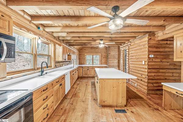 Nestled on 3.55 private acres along South Carolina's scenic Highway 11, this 2,900 sqft log cabin offers a rustic retreat with endless potential. Featuring 3 bedrooms, 3.5 bathrooms, and a spacious room over the 3-car garage, this home combines mountain charm with flexible living spaces. Step inside to soaring cathedral ceilings in the living room and a kitchen designed to impress--complete with abundant countertops, storage, and a walk-in pantry. The main-level master suite includes a walk-in closet and an unfinished full bathroom, giving you a blank canvas to create your dream spa-like retreat. A generous walk-in laundry room adds even more convenience and storage. Upstairs, a loft area overlooks the two-story dining and living room, while two oversized guest bedrooms share access to another unfinished full bath, ready for your vision to take over the space. Above the garage sits a massive room with its own full bathroom which could be a fourth bedroom or a fun flex space. Each bay of the 3 car garage is oversized, totaling just under 1,500 sqft, and offers more than parking. With a storage room, workshop space, half bath, and yard door, it's a true extension of the home, ready to serve a variety of needs. As you walk into the house from the garage, you'll find another large flexible room perfect for a home office, mudroom, or hobby space. Enjoy the peaceful sights and sounds of nature from the 40-foot front porch or explore the wooded acreage with a creek running along the back of the property. The flat backyard is the ideal spot for a future deck or outdoor entertaining area. You're bound to see endless wildlife no matter where you venture on this 3.55 acer lot! A roof was just installed in 2025, dual HVAC systems were replaced in 2019, and all kitchen appliances convey at closing. This property is minutes from Victoria Valley Vineyards, Aunt Sue's, Table Rock State Park, The Rock Golf Course, Bald Rock, Caesar's Head State Park, and numerous beautiful scenic hiking trails and waterfalls. The home does require some renovation work and will not qualify for traditional financing. It is being sold as-is with the seller providing ample of time for inspections to be performed. This beautiful log cabin is priced ready to sale, making it an excellent opportunity for buyers seeking an unique property to customize.