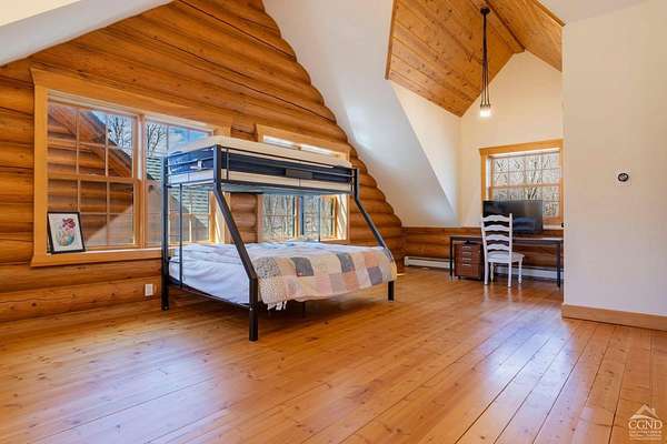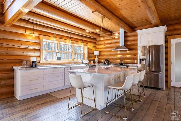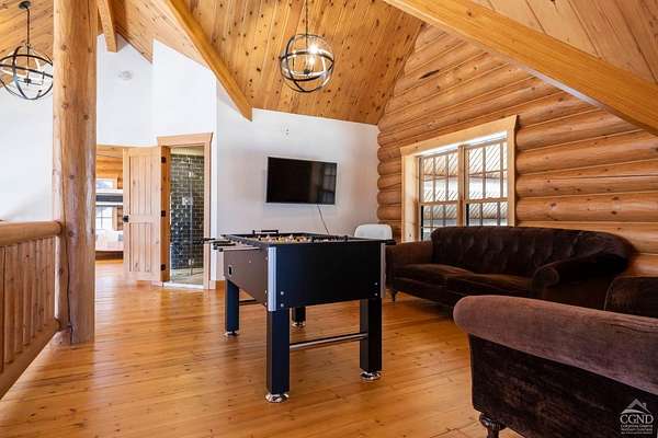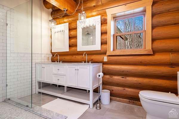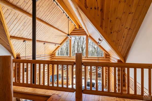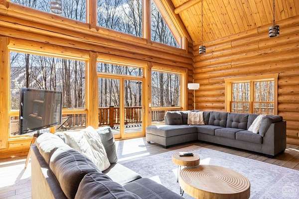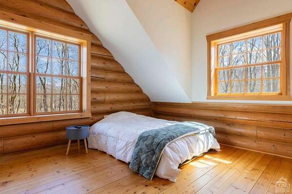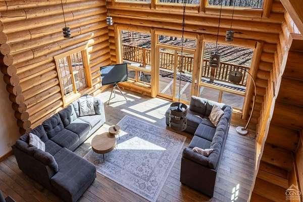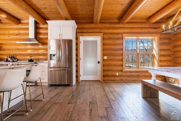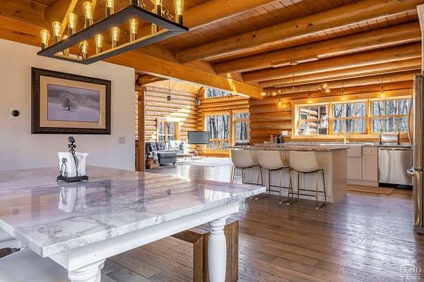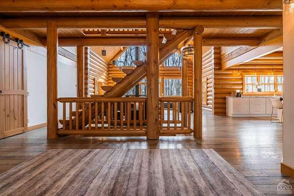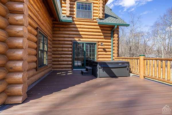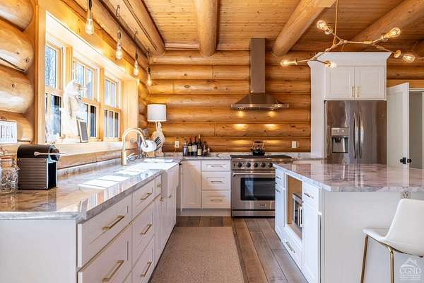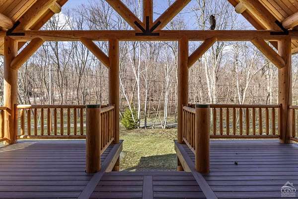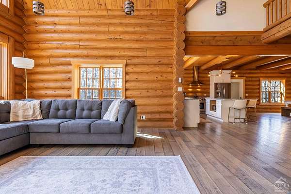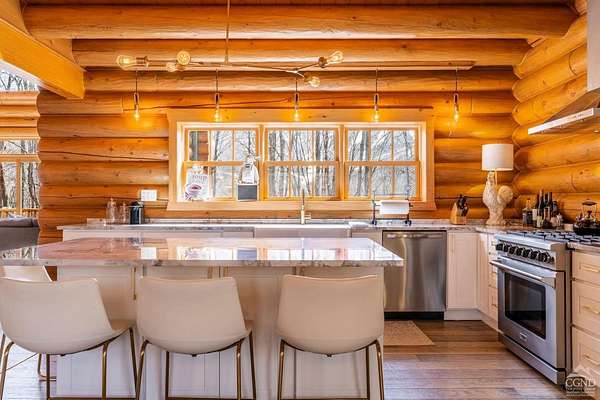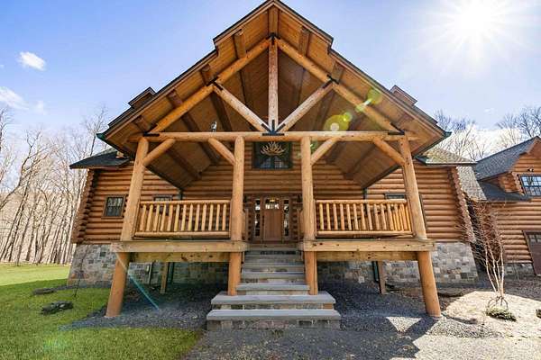 Custom Log Cabin with Modern Finishes, The Feel of a New Build, and Stunning Mountain Views- Nestled on nearly 2 acres, this breathtaking custom log cabin combines luxury, charm, and nature. Built with meticulous attention to detail, the home shows as if it is new construction, exuding a fresh and pristine feel throughout, making it indistinguishable from a brand-new build. With 5 bedrooms, 3.5 bathrooms, and a versatile accessory apartment above a heated 2-car garage, this home offers space, comfort, and endless possibilities. Overlooking Windham Mountain ski slopes, with views from almost every inch of the home, it's perfect for relaxation, gatherings, or as a premium rental investment. The open floorplan features gleaming wood floors and a wall of floor-to-ceiling windows that flood the home with natural light. The living room boasts soaring vaulted ceilings, a cozy wood-burning stove, and seamless access to an expansive wraparound deck, perfect for indoor-outdoor living. The chef's kitchen includes a farm sink, granite countertops, stainless steel appliances featuring a Thor range/oven and modern light fixtures, flowing into a welcoming dining area.The first-floor primary suite is a private retreat tucked behind barn doors, with a luxurious spa-like bathroom including a tiled walk-in shower, a soaking tub, a walk-in closet, and private deck access to a hot tub. Upstairs, the home offers three additional bedrooms, a bathroom, and a loft currently used as a game room but could also serve as the perfect home office. A laundry/mudroom connects the garage and main house. Above the oversized garage, the chic studio apartment features vaulted ceilings, wood floors, cable railing, stainless steel appliances, and a custom bathroom with a soaking tub perfect for guests or as a rental income opportunity with its own private entrance. Outside, relax in the hot tub on the deck while enjoying the incredible mountain views. The property includes a half-moon driveway, covered front porch, and a spacious basement that has been set up with the intention of future completion. Located 2.5 hours from NYC and 5 minutes from Windham Ski Resort, this meticulously crafted log cabin is move-in ready. Whether as a private retreat, vacation home, or investment property, this stunning home offers serenity, beauty, incredible potential. Schedule a private viewing today! A 3D Walkthrough Tour is available in the digital Lookbook or by request from the listing agent.