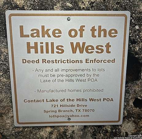 Est $254/moVery Desirable Location. Views of the Texas Hill Country. Residential Lot with Restrictions. No Manufactured Homes or temporary homes. Structures only. Blanco ISD. Low Tax Rate. No Farm Animals Allowed, Cannot be Subdivided. Level lot. Gravel road. Septic needed. Electric & water available on the road. Voluntary POA (LOTH). Community Park. Inexpensive living, with access to Major cities. No Survey Available. CASH, CONV, SELLER FINANCE. BUYER TO VERIFY ALL INFORMATION. Buy today & build later.