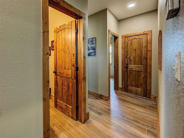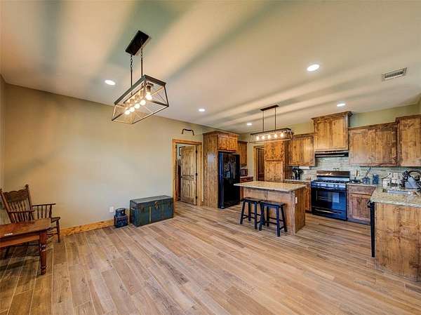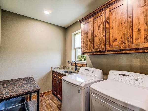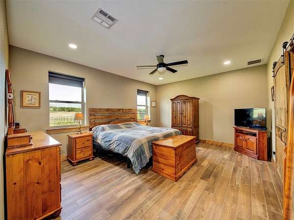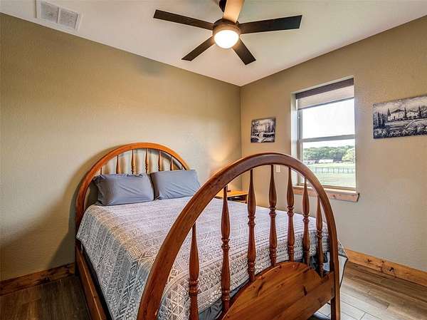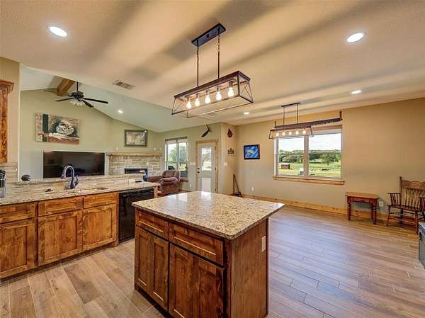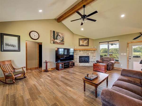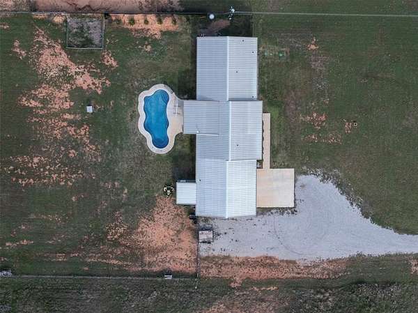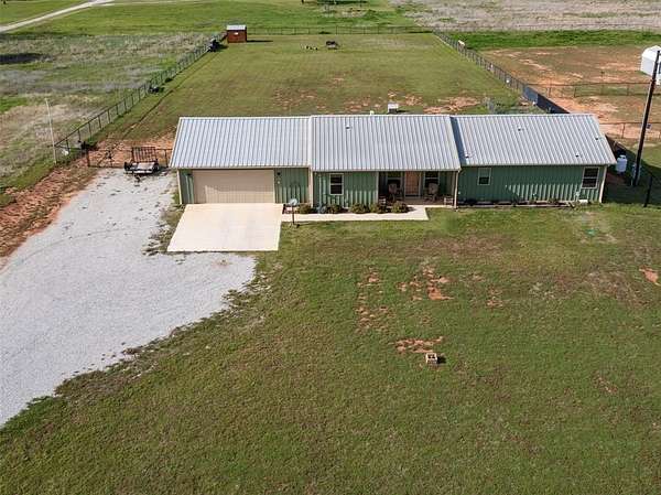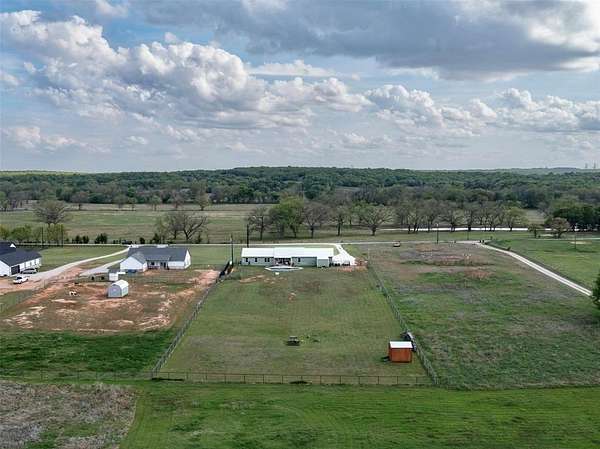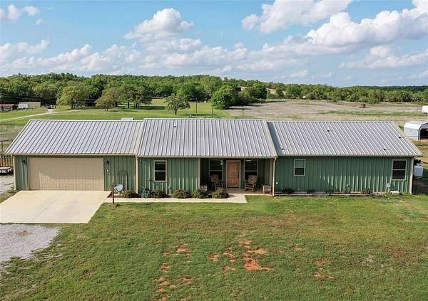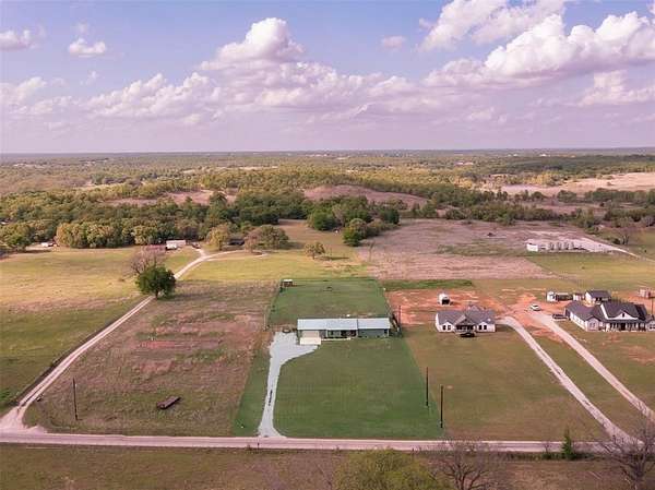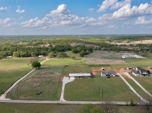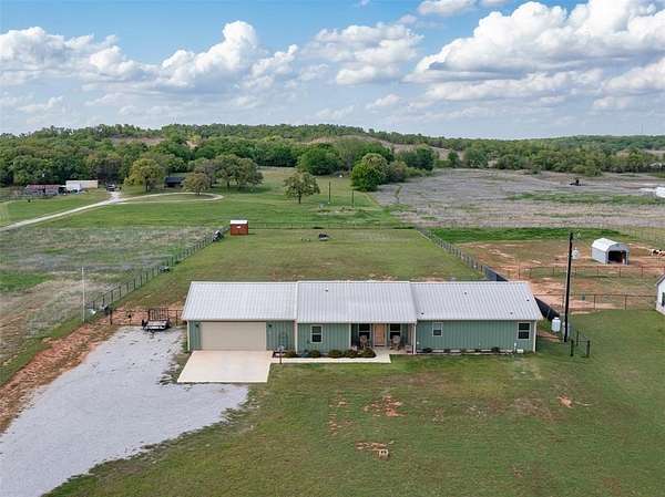 Beautiful custom home on 2.07 acres in the highly sought after Alvord ISD! Nestled outside city limits on a paved county road and surrounded by large acreage, this property offers peaceful country living with modern comfort. Built in 2022, this 3 bedroom, 2 bath home features an oversized 2 car garage and a thoughtfully designed split bedroom layout. Inside, you’ll find wood grain tile flooring, vaulted beamed ceilings, and a stone fireplace that makes a beautiful centerpiece for the spacious living area. There are custom cabinets and granite countertops throughout the entire home. Each bedroom includes its own walk in closet, while the primary suite offers a true retreat with two walk in closets, dual vanities, garden tub, and a separate shower. Additional highlights include a large laundry room with built in cabinets and sink, plus a 5x6 safe room located in the garage, which also features vaulted ceilings. Step outside to enjoy a sparkling swimming pool overlooking the large fenced in back yard. There are also two storage buildings for your convenience. Experience the best of quiet country living with plenty of space to relax and entertain!