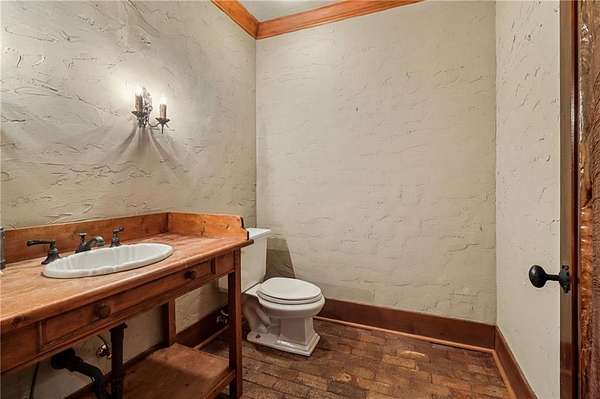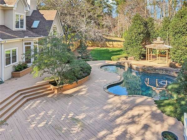 Rare opportunity! Custom, solid-built Marietta estate set on a sprawling, flat two acre lot within a small, secluded community. Serene location featuring a private access road, community pond, and mature trees. This unique home, filled with custom built-ins, hardwood flooring, solid wood doors, classic molding, and well-built construction, exudes charm and timeless appeal, making it the perfect blend of classic character with the opportunity ready for your personalization. Inside features the primary bedroom suite on the main level, large, spacious secondary bedrooms upstairs, all including ensuite bathrooms and walk-in closets. Designed for entertaining, the home shows generous spaces, including the dining room, a spacious kitchen, bright sunroom and living room spaces boasting expansive windows and vaulted ceilings, and the massive basement, adding a home office, bathroom, dual fireplaces, a full custom bar, and an authentic wine cellar. The garage space is very large, with a new garage door (2025), two additional storage rooms for use and a work shop with built in work benches. The exterior includes a new septic tank system (2025), a new exterior paint job (2025), and new gutters and downspouts (2025). The private backyard is perfect, with space to utilize, beautiful mature trees, a large pool, wood deck, grass lawn, and fenced-in dog area with interior access. Convenient location close to all shops, restaurants, ease of interstate access, and more. This home is truly a must see!