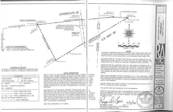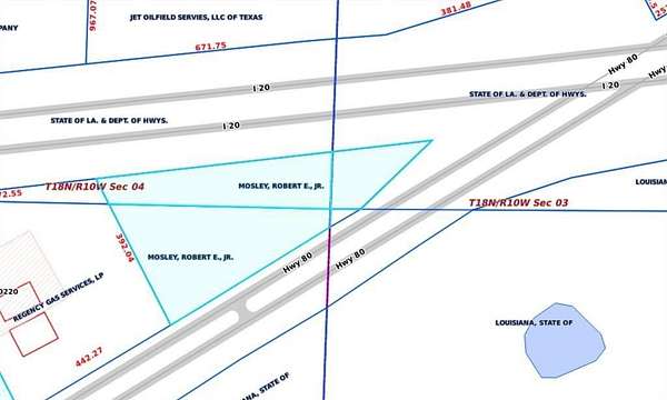 Est $910/moApproximately 4 acres of full parcel #108274C. Located at I-20 & Hwy 80. Survey available indicating 3.77 acres - tax assessor has it at approximately 4.19 acres. Outside city limits - no zoning per Webster Parish Police Jury. Entergy electric, St. James Water System, septic required. This property is not in a flood zone. Vacant land: Showings 24-7. Please schedule through Broker Bay for auto confirm.