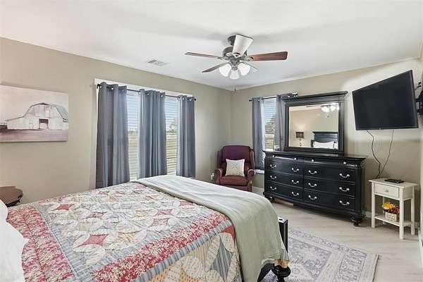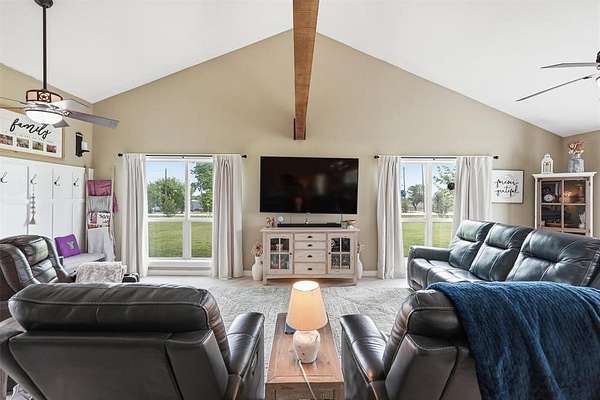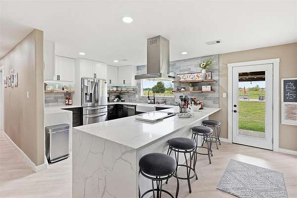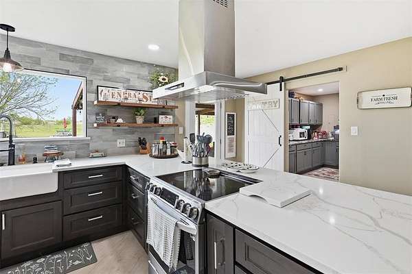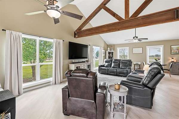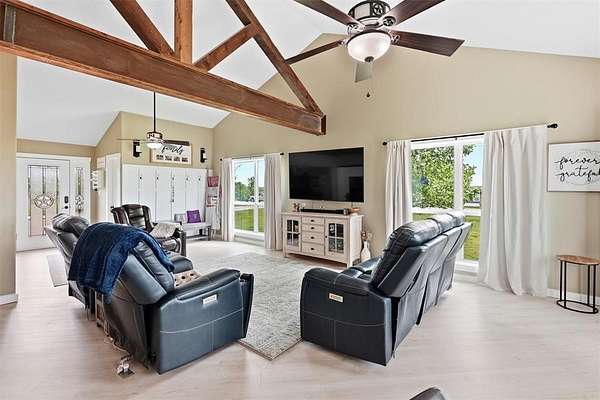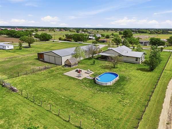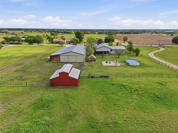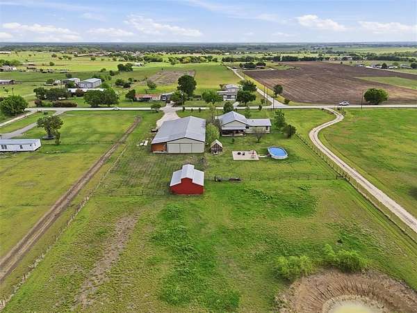 Welcome to this stunning four-bedroom, two-bath ranch-style farmhouse nestled on over three expansive acres in the highly sought-after Grandview ISD. Thoughtfully improved throughout, this exceptional property blends modern design with the charm and tranquility of country living. Step inside to an open-concept floor plan designed for both everyday comfort and effortless entertaining. The gourmet kitchen is a true showstopper, featuring waterfall quartz countertops, a unique walk-through butcher's pantry, and a spacious breakfast bar perfect for gathering. The inviting living room showcases vaulted ceilings and abundant natural light, seamlessly flowing into a large separate dining space ideal for hosting family and friends. The custom primary suite offers a private retreat with a spacious walk-in closet and a beautifully appointed en-suite bath complete with double vanities, a soaking tub, and a separate walk-in shower. Outdoors, this property truly sets itself apart. An incredible metal workshop measuring over 5,000 square feet includes three bay doors, concrete flooring, electricity, and a partially completed apartment with framing already in place, offering endless potential for additional living space, rental income, or a private guest retreat. Additional features include a metal barn, a 10x14 greenhouse, and an above-ground pool with a 25x25 concrete patio, perfect for enjoying warm Texas days. Take in the breathtaking views from the covered front porch or back patio and experience the peace and privacy of wide-open country living. This one-of-a-kind property offers incredible versatility, space, and opportunity and is ready for you to make it your very own!