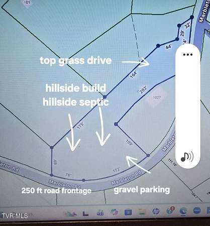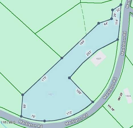 MOTIVATED SELLER Considering Offers! Excellent location for anyone seeking a build site for a tiny home, compact double wide, or any home that is right for you that is BOTH in a COUNTRY SETTING and ONLY 5 MINUTES from the interstate! 1021 Marbleton Road is a uniquely configured, .82 piece of land with hillside, woods, rear grass drive to center of hill-top, and a massive, level road front drive, parking lot, or building site. There is also a storage shed already in place for your convenience! The picturesque views may be enjoyed from just about anywhere on the lot. White oaks, red maples, a buckeye, wild blackberries, and numerous medicinal shrubs and vines are present. This property is inside the city limits but there are NO city taxes! It has been previously perc tested for up to 2 bedrooms depending on location on the lot you choose to build, and a permit was issued. The permit is valid for two more years. The only building restrictions beyond adhering to zoning set-backs are, no single wides, 750 Sqft minimum, and filing for a permit for RV living while home is being built. A variance has been granted allowing the gravel drive to be used for building and there is a plan in place to relocate the power pole and wire. *Water meter has been run to the property with water hydrant installed. *Leased equipment- Utility pole spot light installed and has 4 years remaining on the lease with Erwin Utilities. Cost is 9.00 per month and bills on electric bill. Acreage and other listing details pulled from 3rd party. All information herein deemed reliable but not guaranteed. Buyer / buyer's agent to verify all information. Schedule showings through Showing Time or call listing agent.