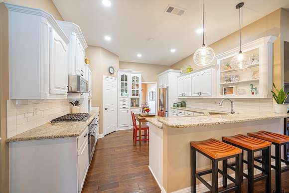 TRADITIONAL ELEGANCE MEETS MODERN COMFORT IN LONG ACRES-Nestled on the edge of the city limits of Mt. Vernon in the sought-after Long Acres subdivision, this expansive 5 bedroom, 3.5 bathroom home offers the perfect blend of tranquility and convenience. Spanning 3,731 square feet, this traditional style residence is set on approximately 3 acres of beautifully landscaped grounds providing ample space and privacy. Step inside to discover a welcoming interior featuring neutral color schemes that enhance the home's timeless appeal. The floor plan includes two spacious living areas, perfect for both relaxation and entertaining. The family room flows seamlessly into the open dining area while a separate formal dining room offers an elegant setting for special occasions. The heart of the home is the kitchen which opens to the family room and boasts granite countertops, stainless appliances, a gas cooktop, plenty of storage and a breakfast bar. The split bedroom layout provides added privacy for the spacious primary bedroom featuring a recently updated ensuite spa bath complete with separate vanities and 2 walk-in closets. Step outside onto the covered patio which leads to the backyard and enjoy year-round relaxation with a heated saltwater pool surrounded by flagstone and fenced for added privacy and security. Additional amenities include a 2-car side entry garage, extra parking, a spacious utility room, a storage building and a storm shelter for peace of mind. Recent updates ensure that this home is move-in ready, allowing you to enjoy all it has to offer from day one. Whether you're hosting gatherings in the formal dining room, cozying up by the fireplace, or unwinding by the pool, this property is designed for both comfort and style. Seller is offering $10,000 in concessions with acceptable offer!!! Don't miss the opportunity to make this exceptional property your own.