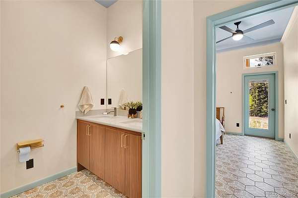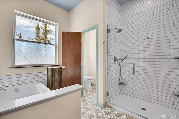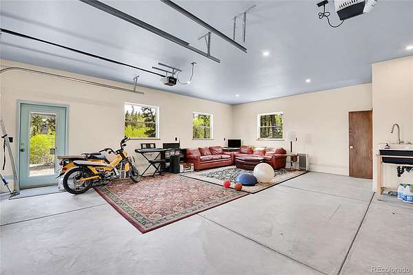 Outdoor living is seamless with a secluded fire pit. The property includes a furnished 192 sq. ft. bunkhouse for guests. An oversized finished garage includes a full bath, and a shed provides ample storage for mountain gear.