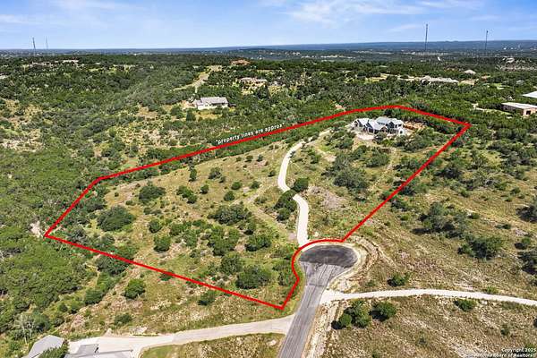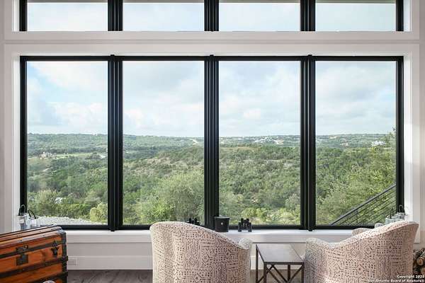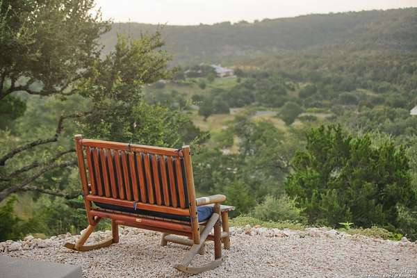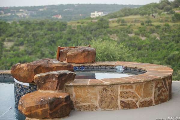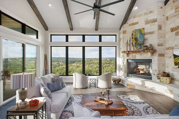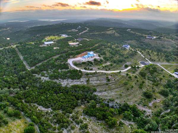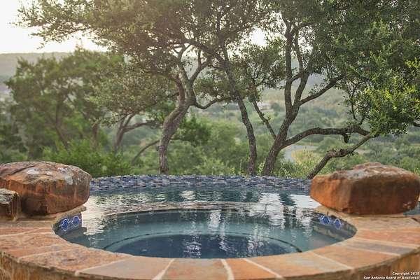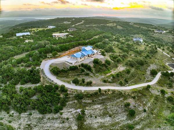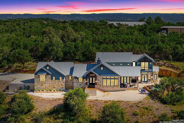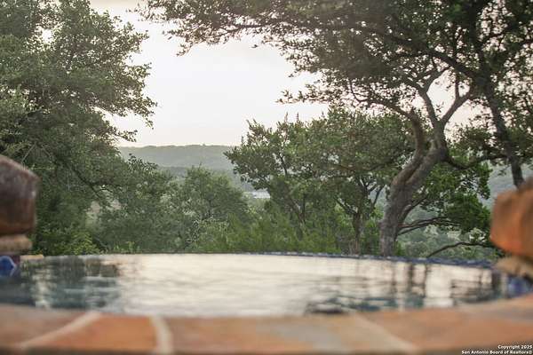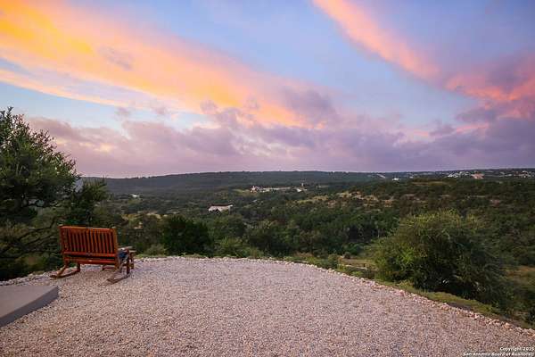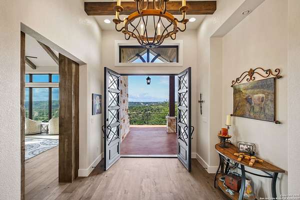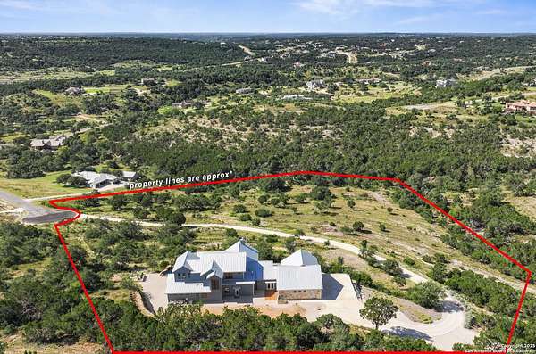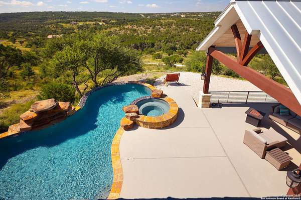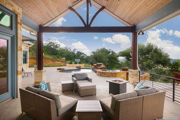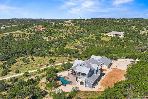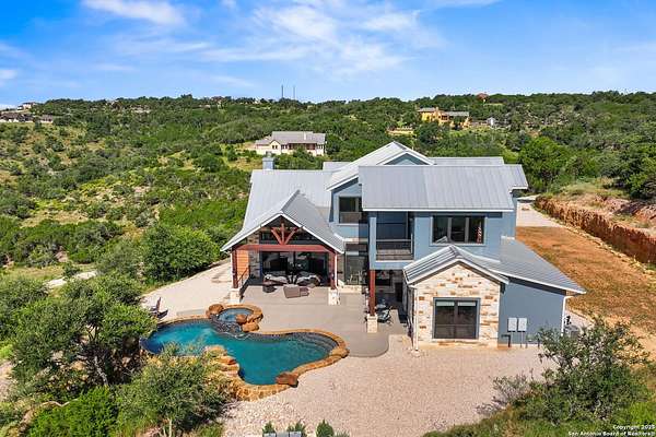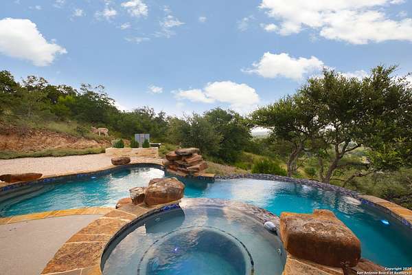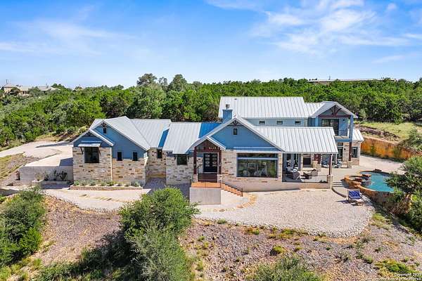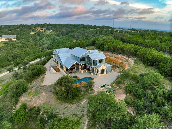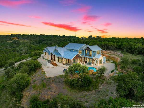 Discover a one-of-a-kind estate nestled in a private gated community in the heart of the Texas Hill Country. Situated on 12.581 acres across two parcels, this custom-built 5,258 sq ft home offers breathtaking 180-degree ridge-top views, unmatched craftsmanship, and modern comfort-all just minutes from the Guadalupe River, Canyon Lake, and over 100 nearby wineries. Designed with both elegance and functionality, the home features 5 spacious bedrooms, 4.5 baths, and expansive living areas that seamlessly connect to the natural surroundings. The great room showcases floor-to-ceiling windows, vaulted ceilings with wood beams, and a custom mesquite fireplace mantle, highlighting the home's rich textures and natural materials. The gourmet kitchen is equipped with a quartz island, granite countertops, upgraded JennAir appliances, and a walk-in pantry with custom doors. A built-in china hutch with granite surface and an ancient mesquite chandelier in the dining area add warmth and refinement. Additional living spaces include a sunroom/office off the master, an entertainment room with wet bar, wine fridge, and fireplace, and an upstairs balcony offering stunning views. Outdoors, enjoy a resort-style experience with a covered patio, in-ground pool and spa with water features, and an infinity edge overlooking miles of Hill Country. The oversized 3-car garage with epoxy flooring, workshop space, EV charging outlet, and additional RV/boat parking ensures plenty of room for all your needs. Built with enduring quality, the home includes a Class 4 impact-resistant metal roof (solar-ready), Zip wall sheathing, spray foam insulation, 3-zone HVAC with heat pumps, and Andersen double-pane windows. Smart home features include WiFi extenders, exterior cameras, monitored security, smart thermostats, and pool and propane control. Other highlights include exotic deer, sheep, and antelope roaming within the gated community, solid wood doors and wood flooring throughout, and wide hallways, oversized doorways, and spacious bathrooms designed for accessibility. The luxurious master suite features dual walk-in closets with built-in dressers, a double shower with rain head, and a custom vanity. Additional features include extensive storage throughout the home-upstairs, downstairs, and in the garage with built-in shelving-as well as private patios for both the master and secondary downstairs bedroom. The home is serviced by city water and a septic system, and includes a 500-gallon in-ground propane tank. A large utility room offers ample storage and everyday functionality. Located within 30 minutes of two executive airports and easy access to both San Antonio and Austin International Airports, this property offers luxury, privacy, and convenience in one exceptional package. Zoned to allow horses, this Hill Country haven is as versatile as it is breathtaking.