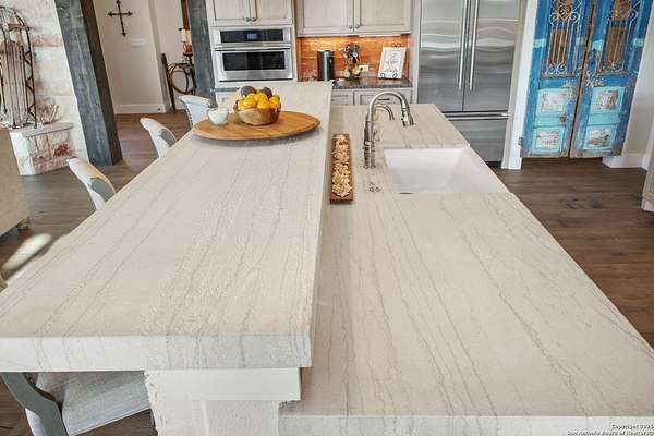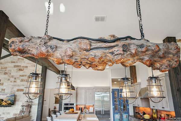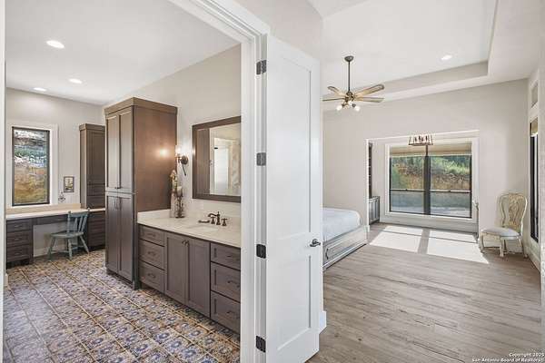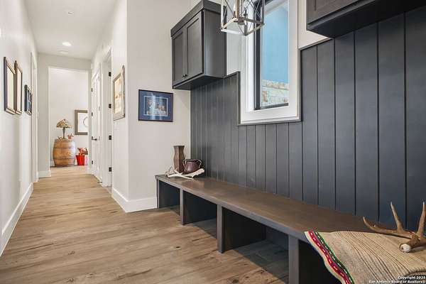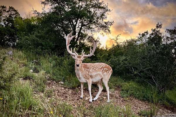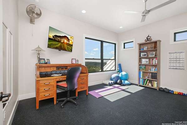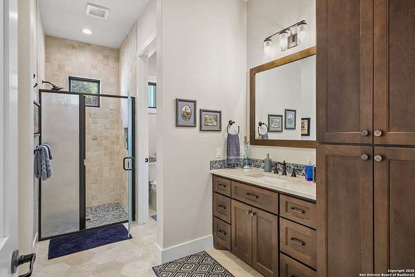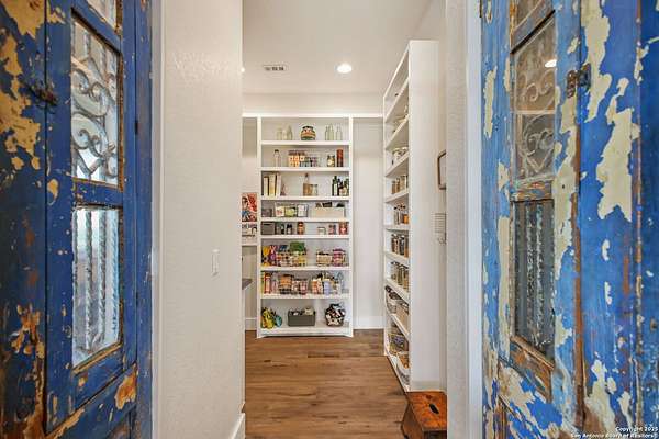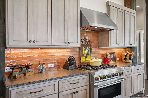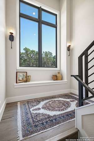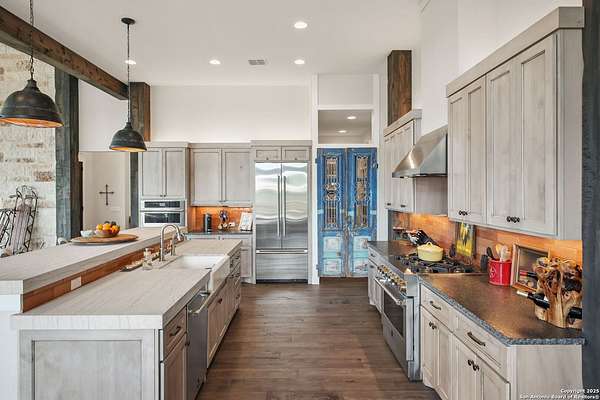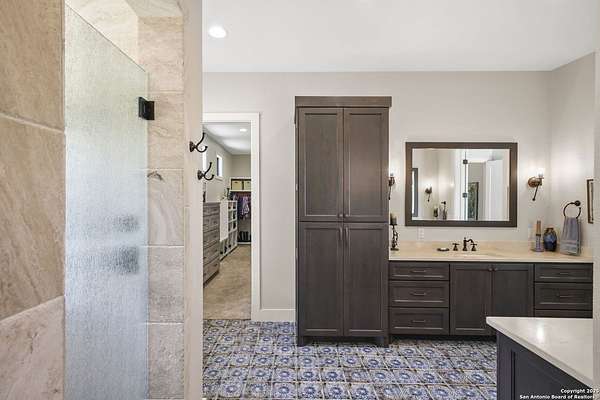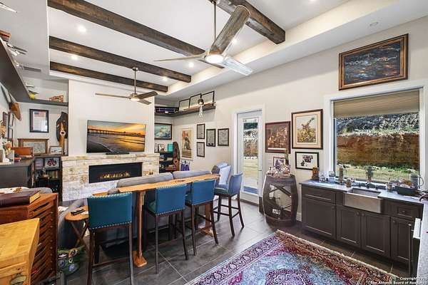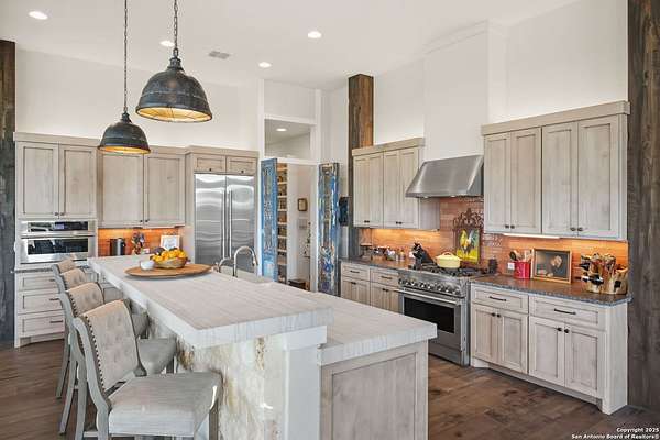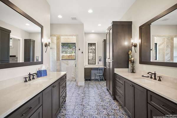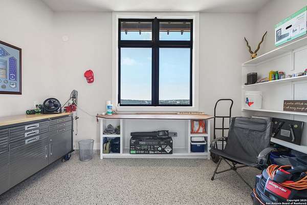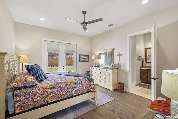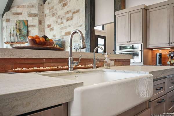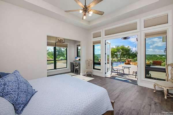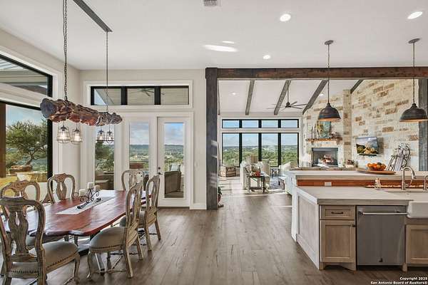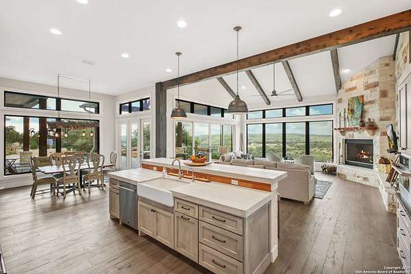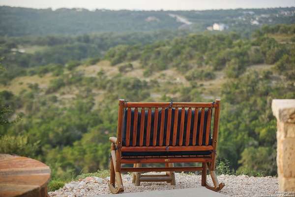 Discover a one-of-a-kind estate nestled in a private gated community in the heart of the Texas Hill Country. Situated on 12.581 acres across two parcels, this custom-built 5,258 sq ft home offers breathtaking 180-degree ridge-top views, unmatched craftsmanship, and modern comfort-all just minutes from the Guadalupe River, Canyon Lake, and over 100 nearby wineries. Designed with both elegance and functionality, the home features 5 spacious bedrooms, 4.5 baths, and expansive living areas that seamlessly connect to the natural surroundings. The great room showcases floor-to-ceiling windows, vaulted ceilings with wood beams, and a custom mesquite fireplace mantle, highlighting the home's rich textures and natural materials. The gourmet kitchen is equipped with a quartz island, granite countertops, upgraded JennAir appliances, and a walk-in pantry with custom doors. A built-in china hutch with granite surface and an ancient mesquite chandelier in the dining area add warmth and refinement. Additional living spaces include a sunroom/office off the master, an entertainment room with wet bar, wine fridge, and fireplace, and an upstairs balcony offering stunning views. Outdoors, enjoy a resort-style experience with a covered patio, in-ground pool and spa with water features, and an infinity edge overlooking miles of Hill Country. The oversized 3-car garage with epoxy flooring, workshop space, EV charging outlet, and additional RV/boat parking ensures plenty of room for all your needs. Built with enduring quality, the home includes a Class 4 impact-resistant metal roof (solar-ready), Zip wall sheathing, spray foam insulation, 3-zone HVAC with heat pumps, and Andersen double-pane windows. Smart home features include WiFi extenders, exterior cameras, monitored security, smart thermostats, and pool and propane control. Other highlights include exotic deer, sheep, and antelope roaming within the gated community, solid wood doors and wood flooring throughout, and wide hallways, oversized doorways, and spacious bathrooms designed for accessibility. The luxurious master suite features dual walk-in closets with built-in dressers, a double shower with rain head, and a custom vanity. Additional features include extensive storage throughout the home-upstairs, downstairs, and in the garage with built-in shelving-as well as private patios for both the master and secondary downstairs bedroom. The home is serviced by city water and a septic system, and includes a 500-gallon in-ground propane tank. A large utility room offers ample storage and everyday functionality. Located within 30 minutes of two executive airports and easy access to both San Antonio and Austin International Airports, this property offers luxury, privacy, and convenience in one exceptional package. Zoned to allow horses, this Hill Country haven is as versatile as it is breathtaking.