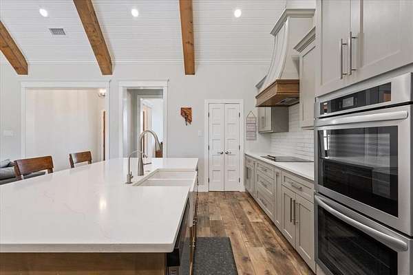 Custom built in 2020, this beautifully designed 5 bedroom, 4.5 bath home offers a spacious living area, a 3-car garage, and 1.79 acres in one of Robinson’s most desirable neighborhoods. The home showcases a stunning open-concept layout with a vaulted living room, indoor fireplace, and a well-appointed kitchen featuring high-end appliances, granite countertops, a large island, and a walk-in pantry. Upstairs, the generous bonus room offers exceptional flexibility and could easily serve as a second primary suite, guest retreat, or media game room. The primary bath is thoughtfully designed with a soaking tub, large walk-in shower, and dual vanities. Additional custom features include a huge laundry-mud room, dog wash, and plumbing in place for a future outdoor kitchen. Outside, enjoy the outdoor fireplace and the natural beauty of a creek flowing through the back of the property. This home shows beautifully and offers a rare blend of thoughtful design, comfort, and upscale function in a neighborhood known for its strong sense of community and favorite trick-or-treating.