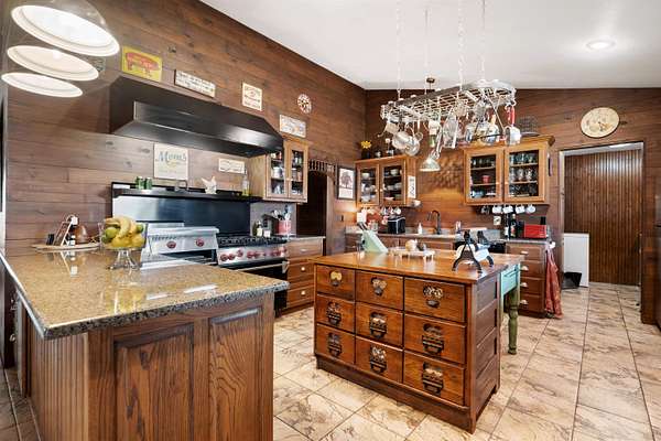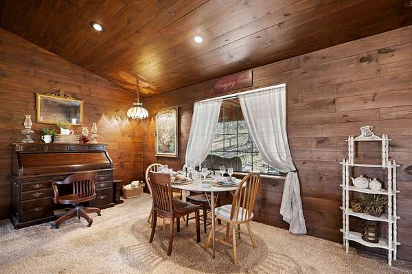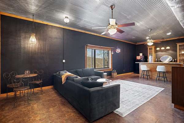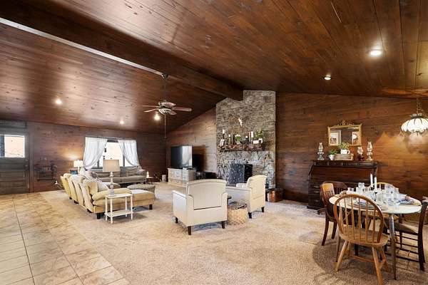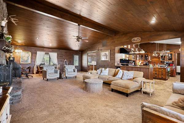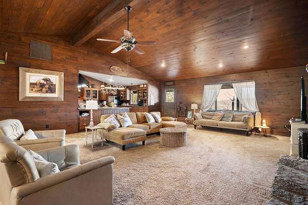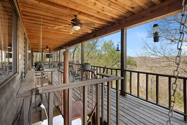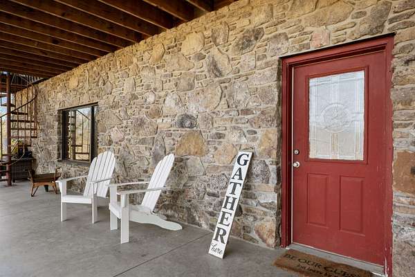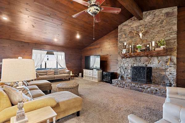 Tucked into the Ozarks, this log and native stone home has that true mountain feel from the moment you pull in. The main level offers 2 bedrooms and 2 bathrooms, with a finished walk-out basement featuring 2 flex rooms and an additional bath—perfect for guests, bunk space, or a second living area. The living room centers around a beautiful native stone fireplace, with an additional wood-burning fireplace in the primary suite and a propane fireplace downstairs. The kitchen is built for gathering with granite countertops, oak cabinetry, and a commercial-style range with double ovens and griddle. Tall ceilings throughout add to the open, comfortable feel. Enjoy the peaceful setting from the covered porch, with seasonal glimpses toward the Sylamore Creek Valley. Additional building with electric on a poured concrete foundation. Located just 12 minutes to the Ozark Folk Center and 17 minutes to Blanchard Springs Caverns—making this a great full-time home, weekend getaway, or vacation rental opportunity.