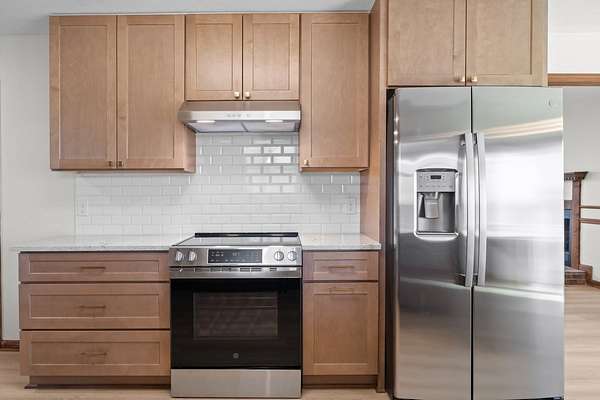 - Dishwasher, Electric Oven, Electric Range, Refrigerator, Stainless Steel Appliance(s)