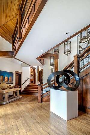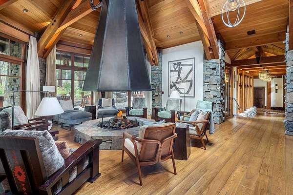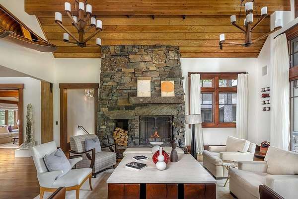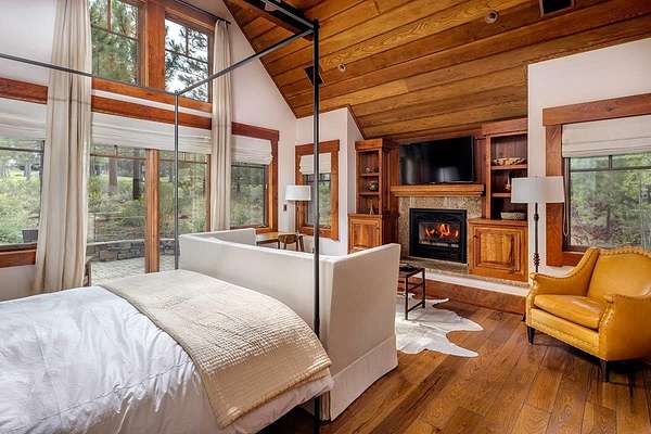 All features of this two-lot estate - its size, location and quality of craftsmanship - collaborate for an elegance normally reserved for the great lodges of America. At 8,946 square feet, this estate features 7 bedrooms, 7 full baths, and 3 half baths, spans two lots, and offers a stunning 180o view of the 18th fairway of the Tom Weiskopf-designed Lahontan Golf Course. That scene of forest fairway and sunset is front and center from an undulating veranda that stretches the length on the back of the home. With its various tables, firepit and intimate coves, the patio is nothing short of a dream setting for entertaining friends and family. From here, it's a short stroll across the fairway to The Lahontan Lodge for a workout, spa session, or an evening of fine dining. The allure of this home, however, makes it hard to walk away from. Upon entering, you're faced with halls leading left and right and a peek at the backyard setting before you. Left leads to a stunning semi-circle bar and a gathering spot unlike any other. At the base of a towering metal flue is a fireplace encircled by seats and doorways sliding open to the back patio. The room's ambience is reminiscent of a mountain chateau where cocktails and the comfort of a fire stokes the kinds of conversation and camaraderie that will long be treasured. Above and behind the bar, a custom metal staircase leads to a media room with two decks and billiard table and, a few steps up, a bedroom with two double beds. Beyond the downstairs bar is a hallway leading to the primary suite with impressive rock fireplace, bold beams, two patios, and an opulent copper bath. Another wing right of the entry leads to the hub of this amazing home - a great room with a big rock fireplace, massive beams, suspended canoe, and access to the fairway-fronting patio. There's a huge central island for breakfasts and late-night gatherings, a dining room with 180o windows, game/breakfast nook, and a kitchen with pantry, impressive stove with iron hood, and a large working counter. A few steps away is an intimate study that can double as a media room. The hallway further meanders toward a gym and a second primary suite with fireplace and patio access, while a staircase leads to a landing where one direction leads to two bedrooms and a sauna while the other course brings you to a bunk room that sleeps eight. As detailed and spectacular as the home may be, it's likewise imbued with a sense of comfort and familiarity, features that make everything from mornings at the breakfast nook to backyard barbecues ideal settings for creating fond memories and lasting legacies. Finally, at all points of this home's exterior is a landscape plan that was masterfully planned and executed and that seems to forever enchant.