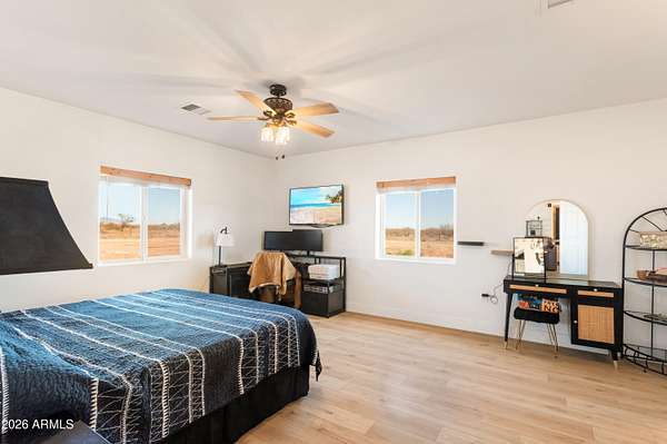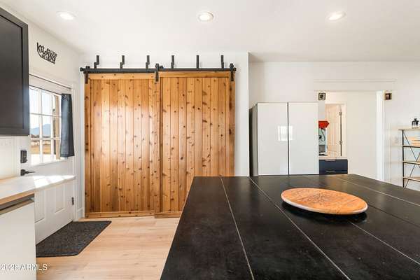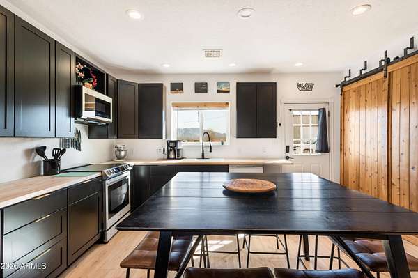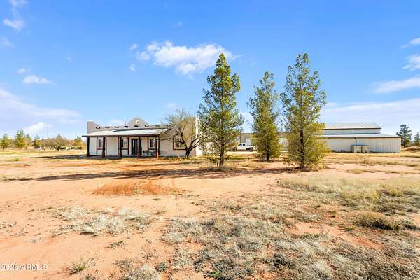 Set on a fully fenced, leveled, and cleared 4 acre parcel, this beautifully updated Santa Fe-style home offers sweeping wraparound mountain views and a sense of privacy that's hard to find. The home has been freshly painted and features brand-new flooring and cabinetry, along with newer appliances (within the last two years), creating a clean and refined interior. Solar panels add efficiency and long-term value. A standout 30'x 40' x 16' steel building includes 110/220 electric, RV hookup, additional lighting, cooling, and an extended concrete slab, ideal for RV owners, hobbyists, or workshop use. An additional dual-height barn provides flexible space for vehicles, equipment, or RV storage. This property offers a rare blend of elegance, functionality, and wide-open Southern Arizona living