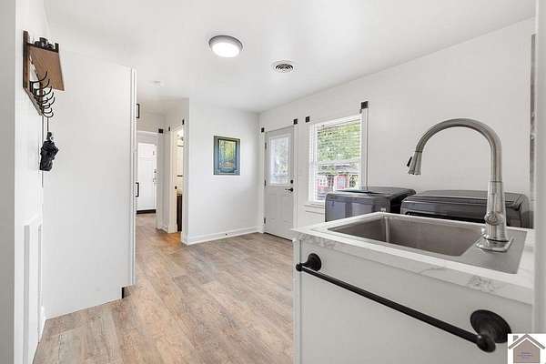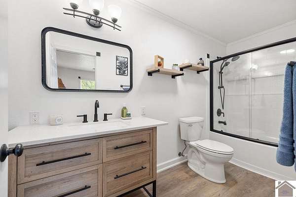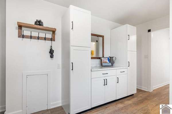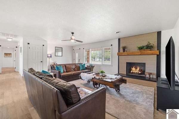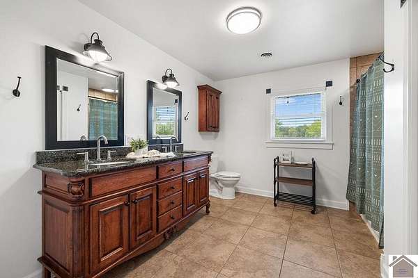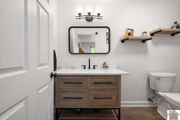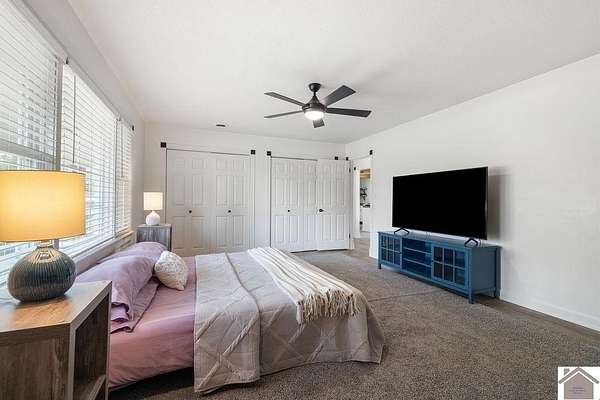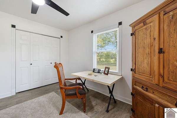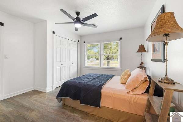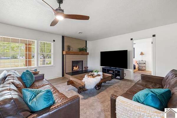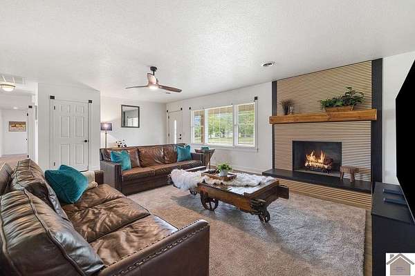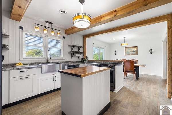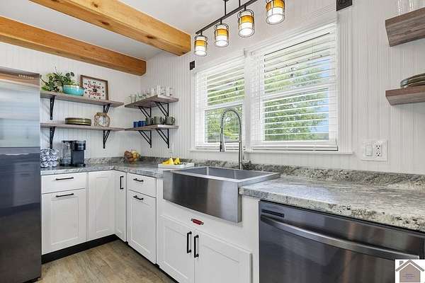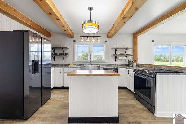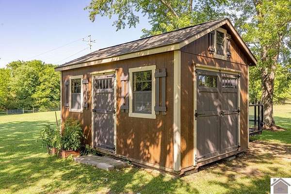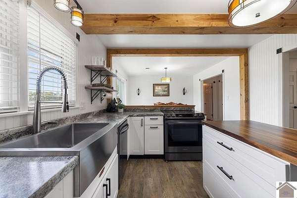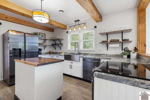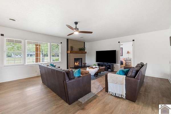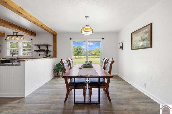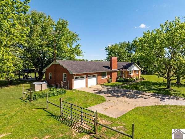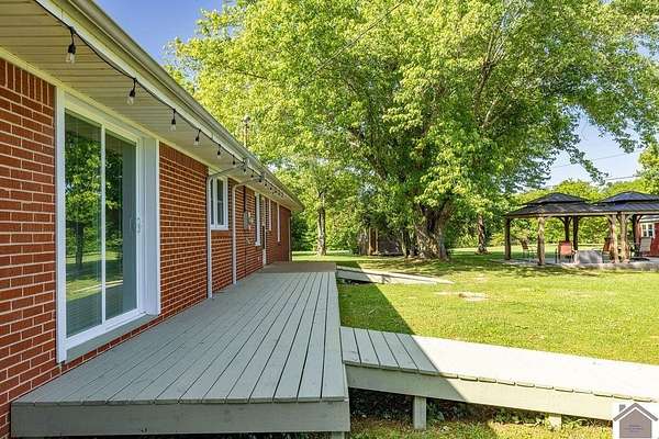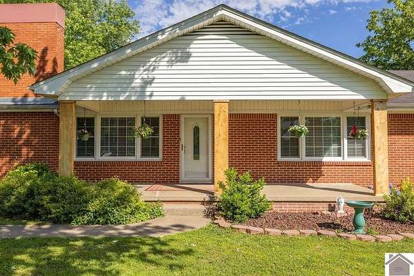 Stunning Brick Ranch, beautifully renovated sits on 3 acres only minutes from Kentucky Lake. Trendy updates abound in this 4BR/3BA ranch featuring luxury vinyl plank flooring throughout 2340sf. There is a cozy gas log fiireplace in the large living area which flows into the dining area and kitchen. The kitchen blends modern style with function, showcasing open shelving and updated kitchen appliances and adjoins a large utility room with abundant pantry and mudroom also with storage. Split bedroom plan offers flexibility with suite on one side and 3 large bedrooms on the other. Step outside to 3 fenced acres, offering a sunny deck, a large covered patio, 2 garden sheds, and plenty of room for outdoor hobbies, gardening, or simply enjoying the fresh air--all just minutes from Kentucky Lake.
