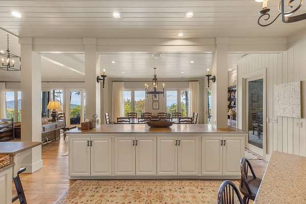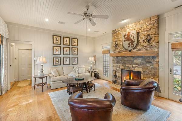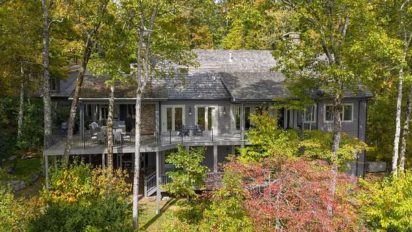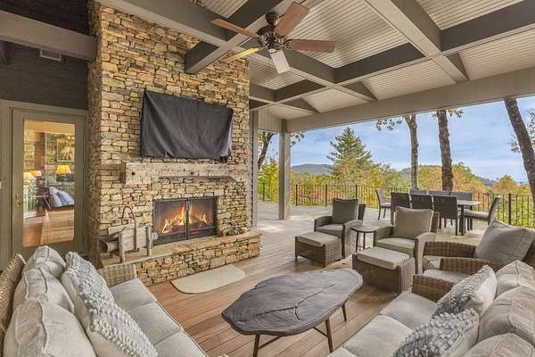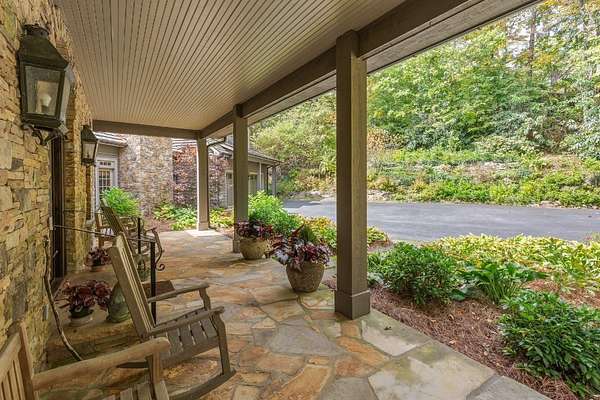 Nestled within the serene embrace of the Blue Ridge Mountains, just a stone's throw away from the acclaimed town of Highlands, North Carolina, lies an estate of style and sophistication. Recognized as the Best Small Town in the Southeast by Travel and Leisure, this remarkable property embodies the essence of luxury mountain living. As you approach on the private driveway, a calm sense of arrival overcomes as the impressive architecture inspires you. Stepping through the architectural door of the main manor, you are greeted by a warm hallway that leads you into the heart of the home. Here, an expansive great room unfolds, adorned with a native stone fireplace and framed by panoramic vistas of the majestic mountains beyond. Seamlessly integrated, the dining area and gourmet kitchen invite gatherings of family and friends, where culinary delights and cherished memories are shared. A cozy snug room with another fireplace awaits you off the kitchen. A sprawling Carolina room porch extends the living space, providing a tranquil retreat adorned with a stone fireplace with connecting uncovered and covered decks, ensuring comfort and enjoyment throughout the seasons. The epitome of refinement awaits on the main level, where the luxurious primary suite offers respite and rejuvenation with his and her bathrooms and closets. Descending to the lower level, discover a haven of versatility, with three bedroom suites, a sitting area, a kitchenette and a wine cellar providing ample space for work, relaxation, or recreation. Nestled nearby, is a fire pit exuding warmth and hospitality. The Highgate community is very popular due to its quiet vibe, closeness to downtown and on the Atlanta side of Highlands.