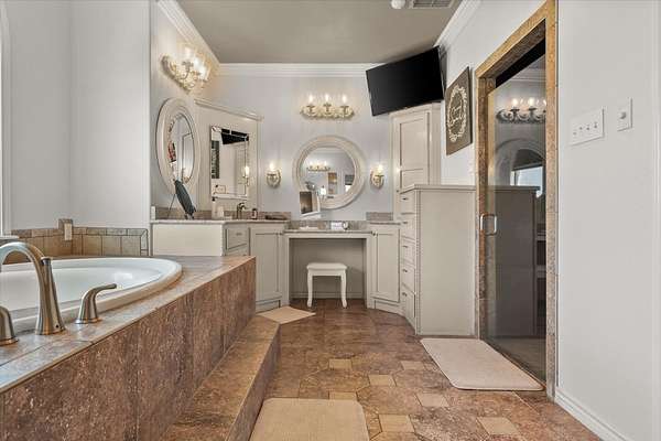 - Breakfast Bar, Ceiling Fan(s), Crown Molding, Cultured Marble Counters, Double Vanity, Granite Counters, High Ceilings, Kitchen Island, Open Floorplan, Pantry, Recessed Lighting, Smart Camera(s)/Recording, Smart Thermostat, Soaking Tub, Sound System, Walk-In Closet(s), Wired For Sound