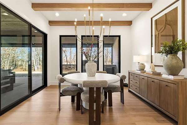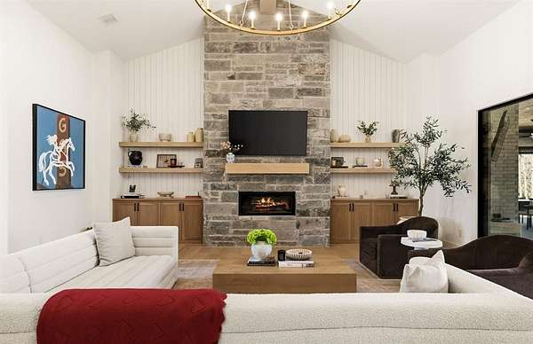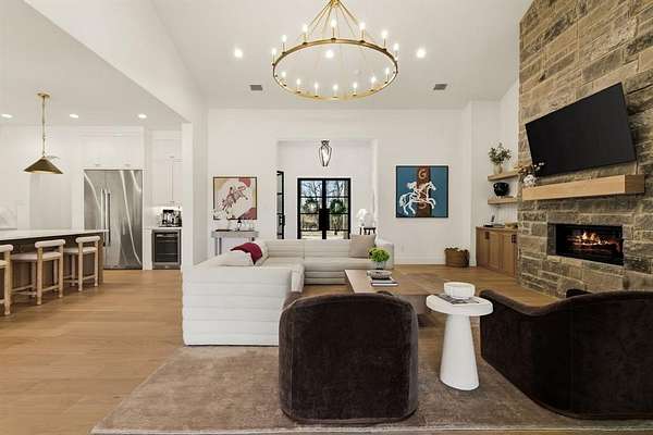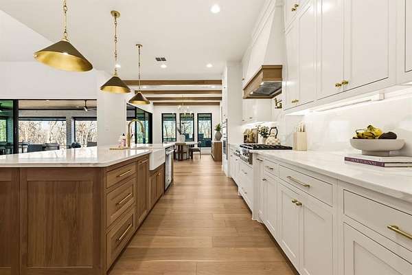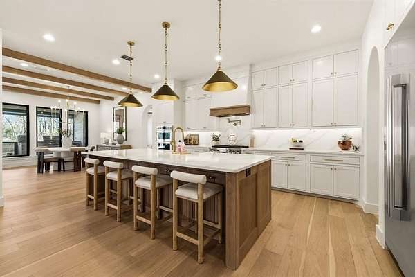 The living and dining spaces transition effortlessly outdoors through expansive custom sliding doors, framing beautiful views of mature oaks. The chef's kitchen is a true centerpiece featuring Signature built-in appliances, built-in refrigerator, pot filler, and a 7x11 walk-in pantry. A generous island overlooks the family room where the fireplace with custom built-ins anchors the space with warmth and sophistication.