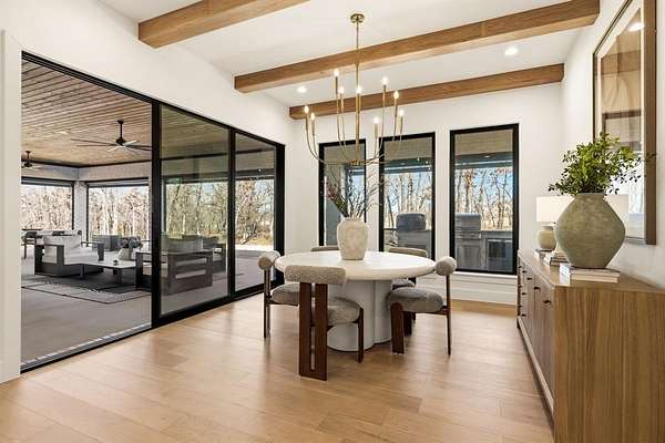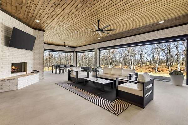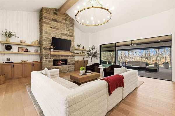 Outdoor living is extraordinary. The over 800 square foot covered porch is fully enclosed with smart home shades, creating year-round comfort and enjoyment. The space features a wood-burning fireplace, built-in outdoor kitchen with grill, sink, and beverage refrigerator, ideal for entertaining while surrounded by nature's peace.