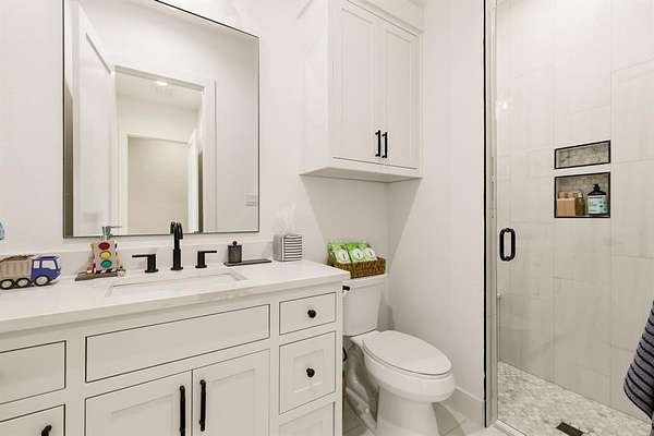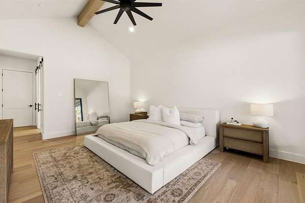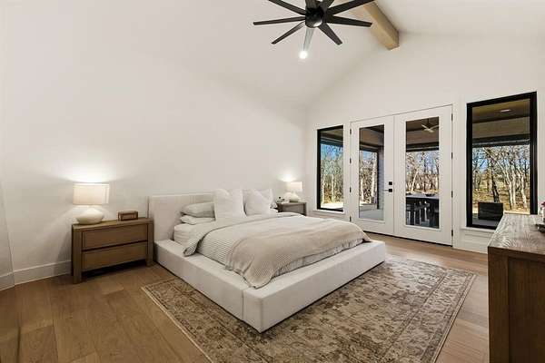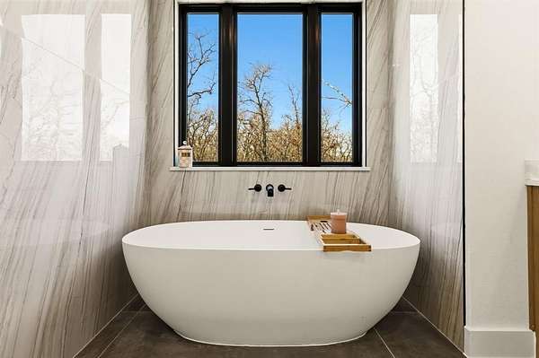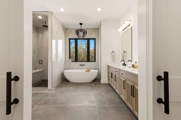 The owner's suite is a private retreat with its own access to the porch, plus a spa-inspired bath offering a freestanding soaking tub, oversized walk-in shower, dual vanities, and a custom closet system. Designer lighting, elevated finishes, and meticulous attention to detail are evident throughout the home.