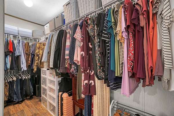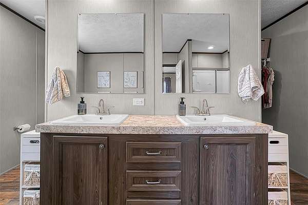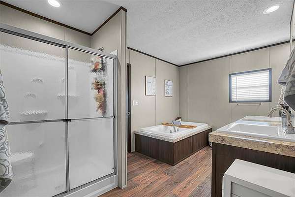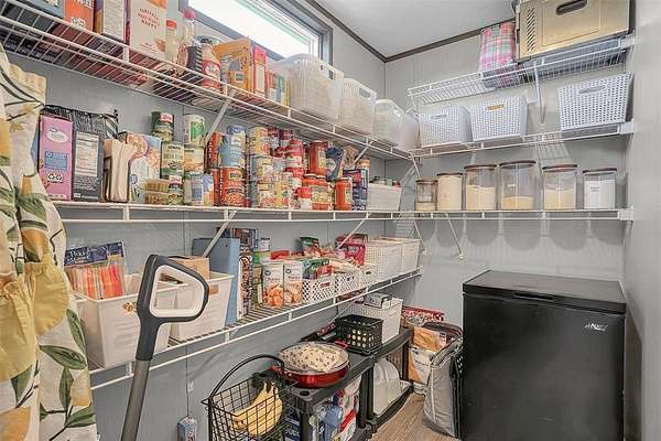 Inside, the home features a spacious, well-designed kitchen with a large picture window framing scenic prairie views. A functional island, oversized drawers, sleek vent hood, and a generous walk-in pantry make the space as practical as it is attractive. The home is thoughtfully designed with walk-in closets, a relaxing garden tub, smart thermostat, and a water softener. A dedicated laundry room includes a folding table that can easily double as a small home office.