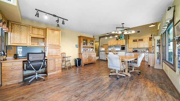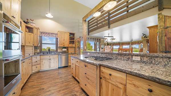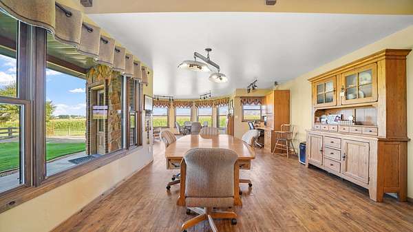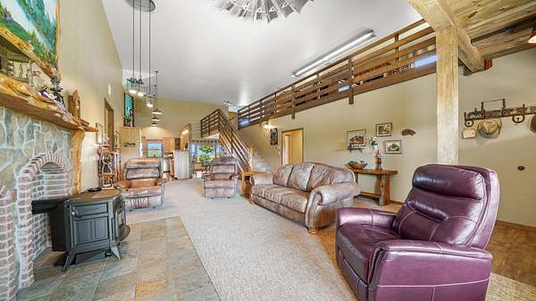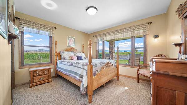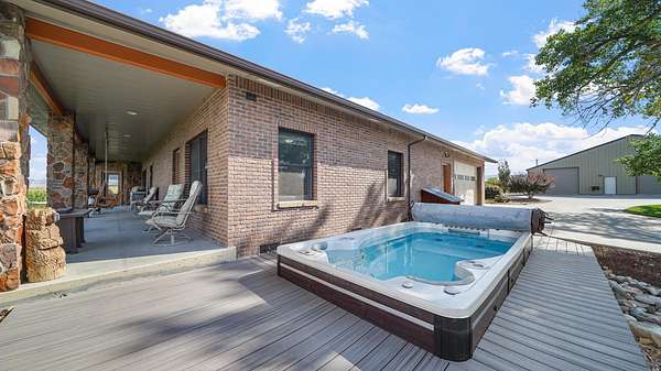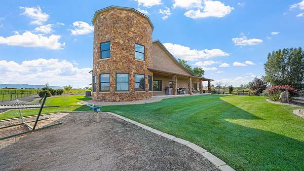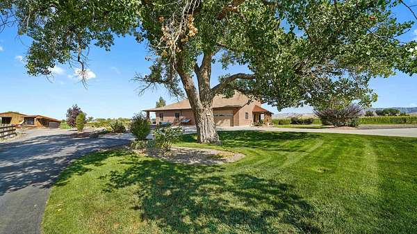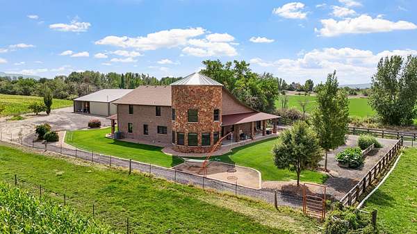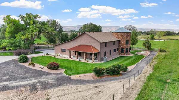 Privacy Views on 7.6 Acres..10 minutes to downtown Grand Junction Rustic elegance and modern efficiency, this nearly 3,800 sq. ft. custom brick home sits on 7.6 acres w/sweeping mountain views. Designed by the original owner/builder this one owner home is both energy-smart and low-maintenance with a complete 10 kWh solar panel system, 2" foam + blown insulation, Jeld-Wen low-E windows with blinds, in-floor heat, air conditioning (not swamp cooler), and thoughtful custom finishes throughout. Property Features Land & Water: 7 Irrigated acres, pond, productive hay pasture (currently in corn), fenced grazing area, manicured yard, raised garden beds, fruit trees with 12 zone sprinkler system to all vegetation. Irrigation piping to remain with the property making this a move-in property. Farm & Animal Facilities: Run-in barn offers clever easy clean removable panels to clean, deluxe chicken coop with run and easy access egg collection, dog pen with protected dog kennel area, tack room with power, cattle guard and fencing and gates fully set up for cattle, horses, chickens, & dogs. Outdoor Living: Drive in on asphalt driveway, two covered porches, mature shade trees, privacy and quiet in this North Area of Grand Junction with just 10 minutes to shopping. Breathtaking mountain views and sunsets. Workshop & Indoor RV Storage 66' x 80' Heated & Cooled Workshop with 21' ceilings 220 power, reinforced floors, R25 walls & R30 roof Divided workspaces, Workshop and RV storage bay areas (12' & 14' doors) Some shelving and bike rack included Exterior covered storage for equipment and firewood Home Highlights: Open Concept Living Dramatic vaulted 17' ceilings, cedar-mantle,new wood-burning stove with custom wood storage closet, central vac, and custom lighting. Chef's Kitchen: Quartz counters, rustic hickory cabinetry with tall uppers , custom eat-in island, large double convection ovens, gas cooktop, high-end fridge/freezer, pantry, appliance garages, and deluxe water purification system. Primary Suite: Split design from main living areas with spa-like bath, double-entry shower, cedar-lined walk-in closet, private access to covered porch, and 14' swim spa (included), plus a 8x8 bonus safe room. Bonus Loft: Custom barn wood feature wall and loft area-perfect for displaying treasures, collectibles, or personal hobbies.Additional Loft Space: Large Bunk room + crafting area (craft table & hutch included)stone-detailed turret ideal for office, gym, library or kids playroom.