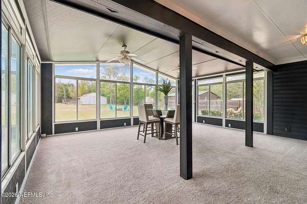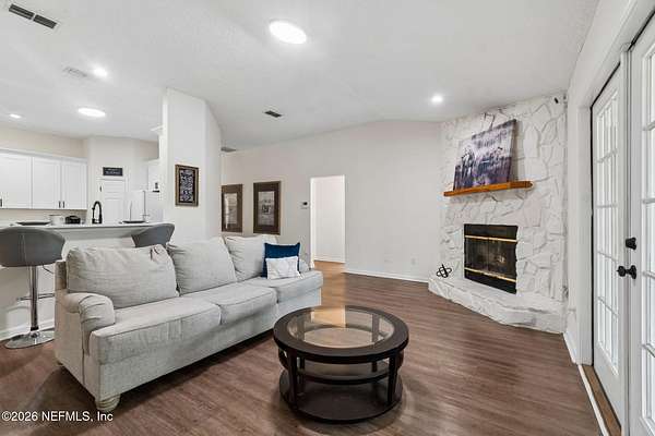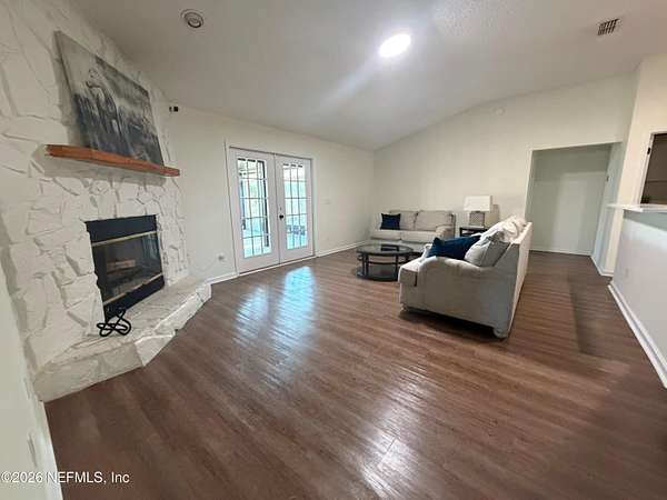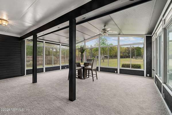 EQUESTRIAN DREAM ON NEARLY 4 ACRES - MINUTES FROM JACKSONVILLE! What an incredible opportunity to own a beautiful country estate on just under 4 acres with a large private pond and you own approximately half of it! Fully zoned for horses, this property is perfect for equestrian enthusiasts or anyone seeking space, privacy, and convenience. This well-maintained home features a split floor plan, spacious rooms, and soaring ceilings centered around a cozy stone fireplace. Enjoy relaxing mornings on the large covered front porch or unwind in the expansive 21' x 21' glass-enclosed Florida room overlooking your land with central Air! Recent upgrades include: Brand NEW kitchen with granite countertops Fresh interior paint Both bathrooms updated with separate tubs & showers New carpet throughout Fresh landscaping Roof replaced in 2021 All of this just minutes from Jacksonville, giving you the perfect blend of country living with city convenience. Don't miss this rare opportunity!