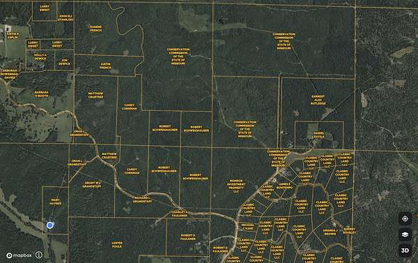 Highway 60 - Highway FF, end of pavement to County Road 459, left at Fork County Road 458 B, to left of County Road 458 A to end of road.