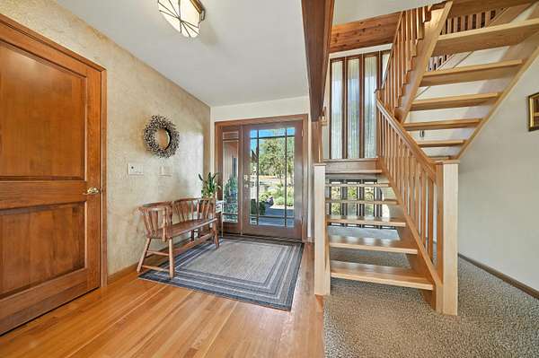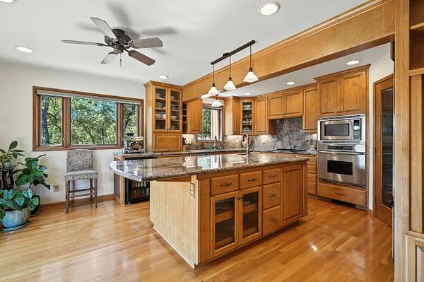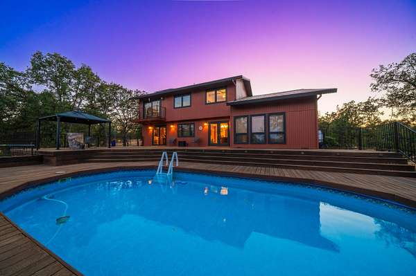 Beautiful private custom home located on approx 4.5 acres with gated driveway. Soaring ceilings, stunning hardwood flooring and the views and sunrises over beautiful Mount Lassen are exceptional! Relax on the large deck by the pool and enjoy the sights and sounds of nature. The gorgeous chefs kitchen has tons of storage, under mount lighting, large granite island, warming drawer, built-in refrigerator, kitchen aid mixer with lift mount, and so much more! The first floor home office with built-in cabinets and Starlink internet make for a wonderful space to work from home. The exterior of this home has been recently painted and the metal roof and owned solar system with battery back-up were installed approx 2 years ago. Located just minutes from both Redding and Palo Cedro shopping and schools this home has it all!