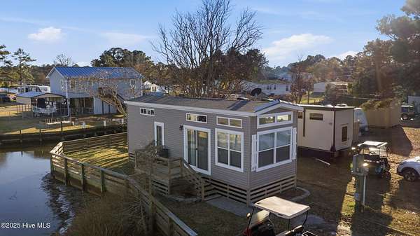 Charming tiny home(titled as RV) waterfront retreat located along a canal leading out to the Currituck Sound! This thoughtfully designed 1-bedroom, 1-bath home with a loft offers an efficient yet comfortable layout filled with abundant natural light throughout. The kitchen is equipped with a gas range and refrigerator, perfect for everyday living or weekend getaways. Enjoy outdoor living in the fenced backyard, ideal for pets or relaxing after a day on the water. The canal has been recently bulkheaded, and residents enjoy access to a neighborhood boat ramp and nearby restaurant. A unique opportunity to own a low-maintenance coastal escape with big lifestyle appeal.