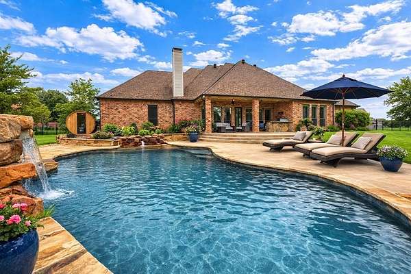 Step outside to your private backyard oasis featuring a lagoon-style pool with waterfall and firepit, surrounded by wrought iron fencing and ample yard space. The covered outdoor living area includes an outdoor kitchen with built-in BBQ, beverage fridge, granite countertops, TV, and outdoor speakers, plus an additional sun patio with loungers and umbrella stands.