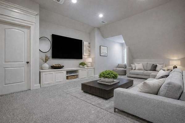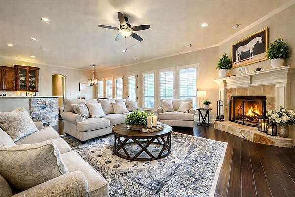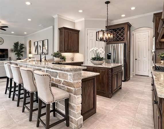 The open-concept island kitchen is the heart of the home, featuring stainless steel appliances, pot filler, multiple pantries, large island, and stone façade bar area, all overlooking the Texas-sized living room with corner fireplace, built-in TV cabinetry, surround sound, and wood floors. A rare downstairs game room with dual entry access adds even more space for entertaining.