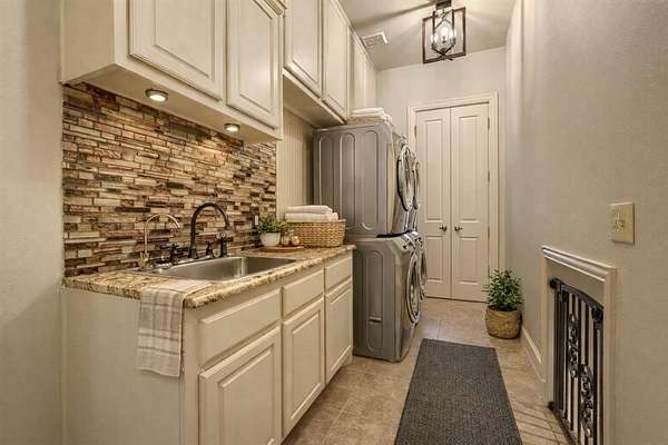 Additional highlights include oversized garage with wood doors, updated zoned HVAC , sprinkler system, custom millwork, hidden safe, abundant storage, extra parking, plantation shutters, and an oversized utility room with space for two sets of washers and dryers.