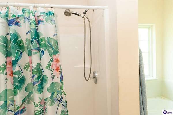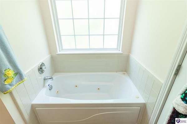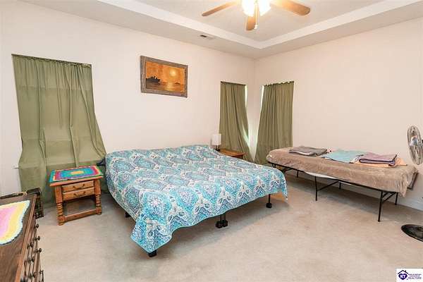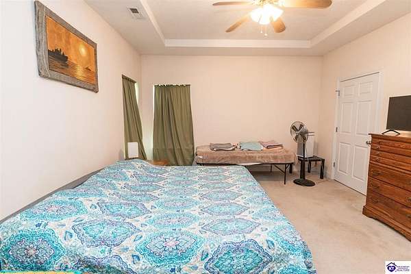 Come tour this lovely 3 bedroom, 2 bath ranch style home sitting on 2 acres in the sought after LaVista neighborhood. The kitchen is large with lots of cabinet and counter space, plus a great pantry. There is a nice dining area off of the kitchen with a nice view of the deck and back yard. This area is open to the huge living area that is perfect for gathering and entertaining. The 9 foot ceilings throughout the home make it feel even more spacious and roomy. The main living area also features vinyl plank flooring. The primary suite is quite large and is on the end of the home and also has great views out the windows. In addition, the primary bath has dual vanities, a jetted tub, and separate shower. The guest bathroom also has dual vanities for everyone to have their space. Both guest bedrooms have ceiling fans and are nicely sized. Outside is where this property really shines. The covered front porch is great for hanging plants or sitting and enjoying the country atmosphere. If the sun gets too bright, you can always hop around to the back deck and relax as well. Or, one of the best features of this property is the parklike area down the hill next to the creek. You can set up a wonderful area to hang out, play games, or whatever recreational activities you might like. You have to see it to believe it, so set up your private tour today. You don't get many chances to have 2 beautiful acres so close to all the amenities of Elizabethtown and Fort Knox.