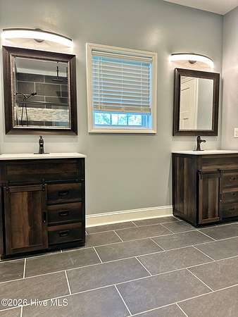 Welcome to Meadowview Road, just outside Jacksonville, where space, comfort, and versatility come together on over 1.75 tree-lined acres. This expansive home offers more than 3,100 heated square feet and a flexible layout designed to fit a variety of lifestyles. Featuring two primary suites on the main level, this home is ideal for multi-generational living or added privacy. The first suite includes a beautifully updated en-suite bathroom with dual vanities and a tiled walk-in shower overlooking the backyard. The second suite also offers dual vanities and a relaxing soaking tub. A third bedroom, full bath, dedicated office, and a convenient mudroom/laundry room are also located downstairs. Enjoy cozy evenings by the fireplace in the den, or gather for game days and entertaining in the oversized living room. Upstairs, a massive bonus space is divided into two sections and offers endless possibilities, from a home theater or gym to a playroom or hobby space. The open-concept kitchen provides ample room for cooking, dining, and entertaining, with space for bar seating and gatherings. Step outside to enjoy the back deck, perfect for summer BBQs, or unwind by the saltwater pool in your own private backyard retreat. Located outside city limits, this home offers a peaceful setting while remaining conveniently close to schools, shopping, restaurants, military bases, and medical facilities.