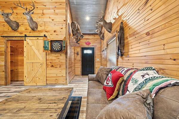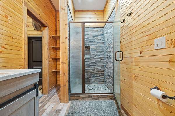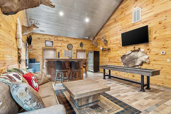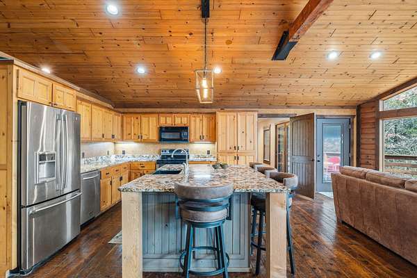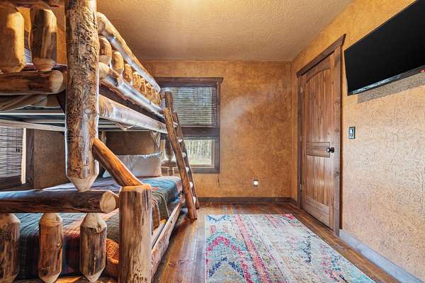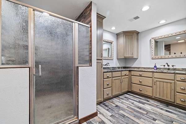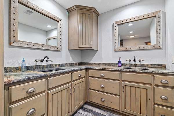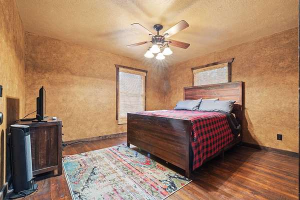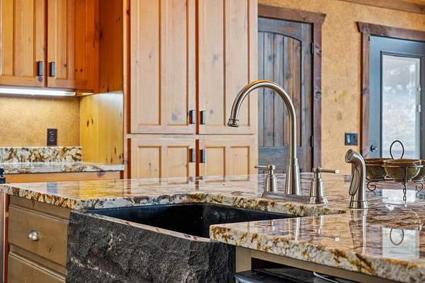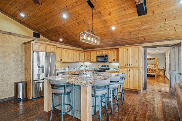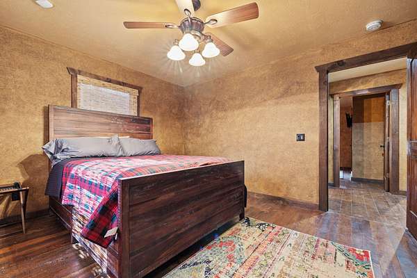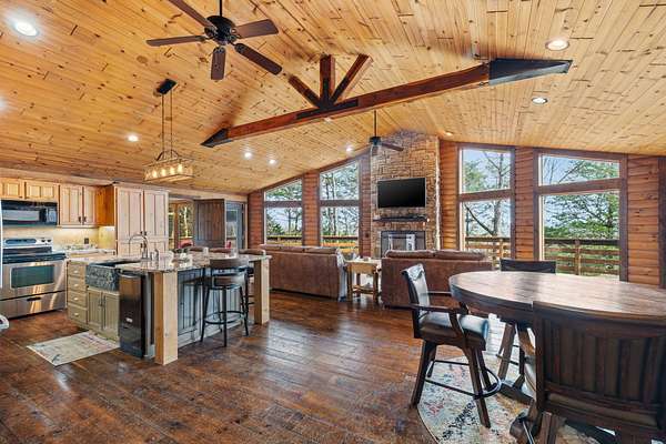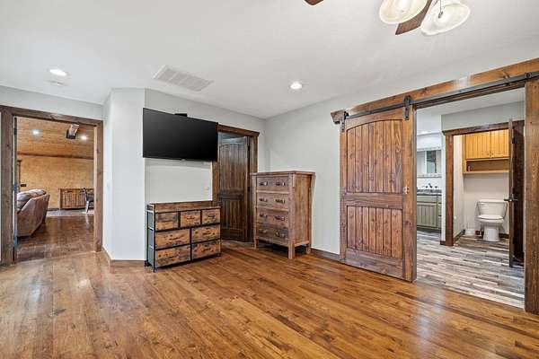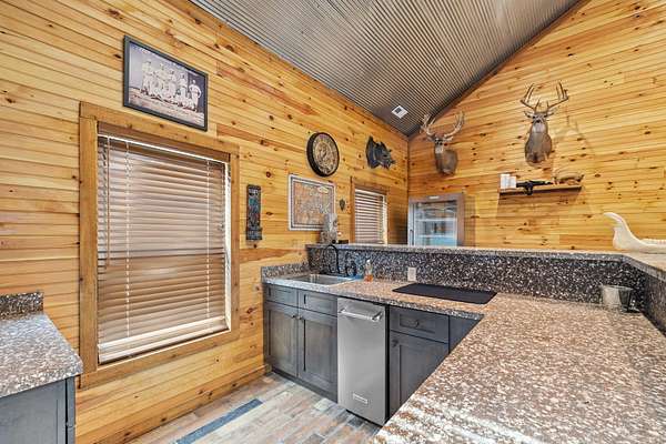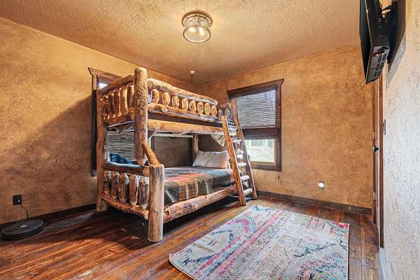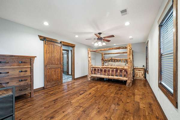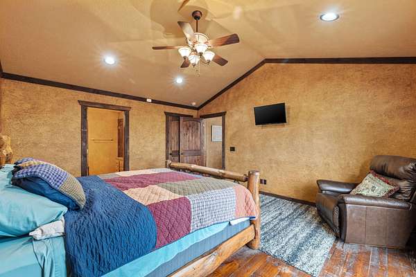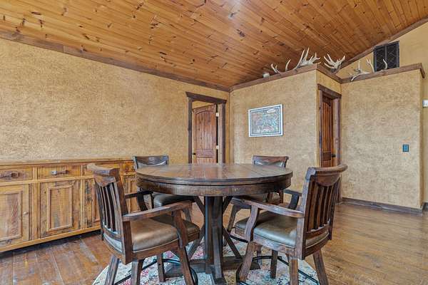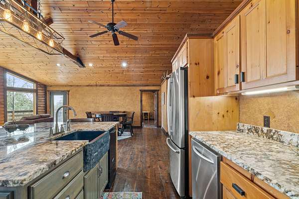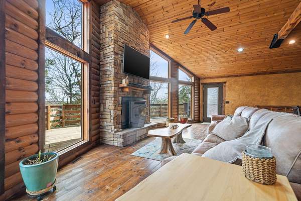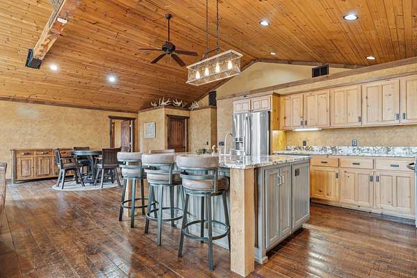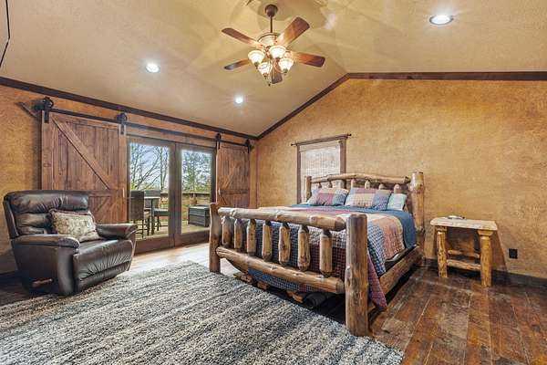 This beautiful rustic home features stunning floor-to-ceiling windows that bring the outdoors in with natural light and scenic views. This home offers two primary suites, perfect for multi-generational living or hosting guests. The kitchen features granite countertops and ample space for cooking and entertaining. The detached garage is perfect for storing your vehicles or recreational toys with an apartment-style suite, ideal for guests, rental potential, or a private office. Plus a storm shelter. A rare combination of privacy, space, and unique lodge-style charm is waiting for you!