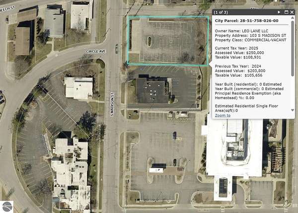 Est $4,770/moPrime downtown development parcel off Front Street near Munson Hospital. 0.45 acre lot has 106' on Madison and is 182' deep. Perfect site for multi-family, condos, medical, office, or mixed-use. Zoning is H-1 and municipal water & sewer are available. 224 Circle Drive across the street is also available for sale and development. Owner is a licensed real estate agent in the state of Michigan.