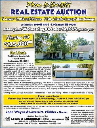 OPEN HOUSE - Wednesday, October 8 from 4:00-5:00 pm - Call to register and to place your bids anytime prior to the auction close. Auctioneer will be on site by 4:00pm on auction day 10/14 to accommodate onsite bidders. We will finalize bidding right after 5:00pm bidding deadline "Soft close". Approx. 2,812 sq. ft. of finished area partial 2 story home on partial basement, 3 bedroom (possible 4), 2 bath, w/newer LP gas furnace, 30'x 56' 3-car garage/shop, 16' x 24' chicken coop/dog kennel, 16' x 24' older granary building, 10' x 14' utility shed, 10' x 16' animal shelter, large garden area, grape arbor, black & red raspberry plants, shared with neighbor fish pond, partially wooded, 5 acres of slightly rolling land with fenced in pasture areas. Buyer to pay 10% down as earnest money deposit at the conclusion of the real estate auction. The balance of the purchase price to be paid at time of closing. Keep in mind that your bidding is NOT contingent upon financing or inspections, so be certain that you have arranged for financing or inspections, if you need them, and are capable of paying the balance at closing. This property is being sold subject to owner's acceptance of the final bid.