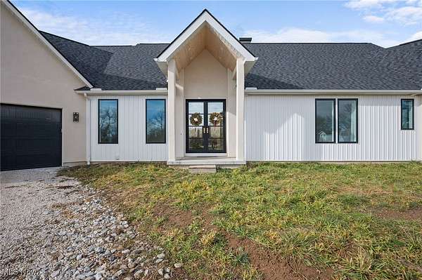 Set on over 5 acres in Lake Twp in the Lake Local School District, this newly built home delivers a refined blend of modern design, thoughtful craftsmanship & everyday functionality. With 2,829 sq ft, 3 bedrooms & 2.5 baths, the home is designed to offer elevated living & effortless flow. The open floor plan is anchored by soaring ceilings & exceptional natural light throughout. The great room makes a striking impression w/ exposed beam ceilings, a dramatic fireplace, expansive island w/ breakfast bar, built-in cabinetry & coffee bar. Custom Amish-made cabinetry is featured throughout, paired w/ high-end engineered hardwood flooring & carefully selected finishes at every turn. The chef's kitchen offers Taj Mahal quartzite countertops, stainless steel appliances, an appliance lift system, "VacPan" vacuum & built-in desk. A butler's pantry adds additional prep & storage space. The dining room is a true showpiece w/ a 12-ft vaulted ceiling & floor-to-ceiling windows on all sides, w/ direct access to a covered outdoor area, ready for a future patio. A bonus room off the foyer offers flexibility as a home office, den, or additional living space. The primary suite is a private retreat, w/ a spacious walk-in closet & a spa-inspired en-suite bath w/ oversized zero-entry shower & rough-in for a bathtub. One guest room has a walk-in closet & en-suite bath. Additional highlights include a heated & cooled attached 2-car garage, whole-house interior, exterior & garage speaker wiring, exterior water spigots w/ hot water, gas line for generator, electric rough-in for under-cabinet island lighting & dedicated water line for a built-in coffee machine. The home is equipped with extra-large A/C capacity for efficiency & comfort. The full 9-course basement offers exceptional future potential w/ rough-in for a full bath, kitchen w/ garbage disposal, sauna, and more. Located just minutes from OH-43, OH-619, parks, shopping, dining & local attractions. This home is a must see!