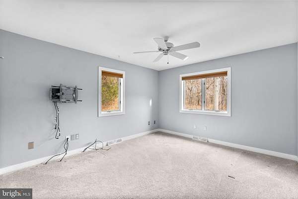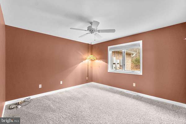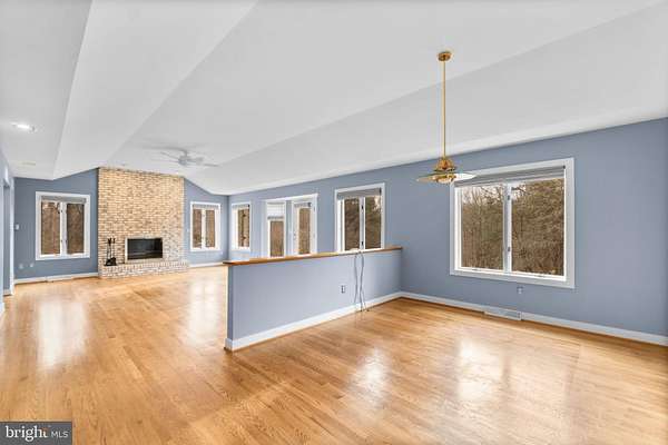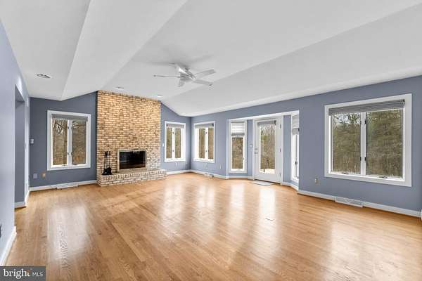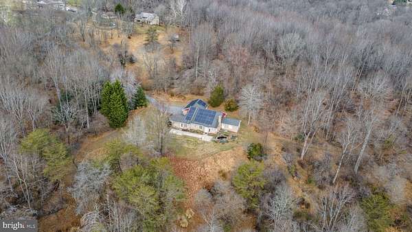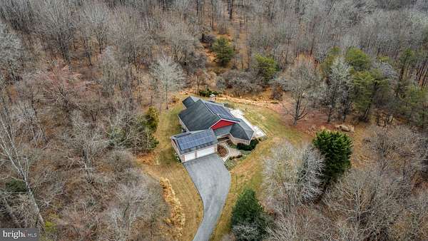 Beautiful contemporary rancher tucked at the end of a long private driveway, featuring a full brick facade, 3 bedrooms, 2 bathrooms, and 2,455 finished square feet on over 11 private wooded acres in serene Woodstock Ridge Estates. A thoughtfully landscaped front exterior and paved walkway lead inside to a welcoming foyer. The open-concept main level features gleaming hardwood floors throughout the living and dining room with a floor-to-ceiling brick-accented wood-burning fireplace, abundant natural light, and bay architecture with patio access, creating a warm and inviting living space. Off the dining area, discover an airy, oversized eat-in kitchen complete with an island, granite countertops, stainless steel appliances, a writing station, two pantries, a stylish backsplash, and a cozy breakfast nook with exterior access-ideal for casual meals or morning coffee with views of nature. Continuing on the main level are three comfortable carpeted bedrooms, two full bathrooms, and a dedicated laundry room. The owner's suite offers private yard access, a walk-in closet, and an updated ensuite bathroom, while a secondary bedroom features a closet organization system for added storage. The lower level provides a blank canvas for future customization, including a bonus room and generous storage areas-perfect for a workshop, hobby space, or expanded living. Outdoor amenities include a three-car garage, a spacious patio, and a picturesque fish pond with a stone waterfall feature, all set against a backdrop that backs directly to Patapsco State Park, offering privacy, natural beauty, and endless recreational opportunities. Additional highlights include solar panels that provide comfort, efficiency, and long-term savings.