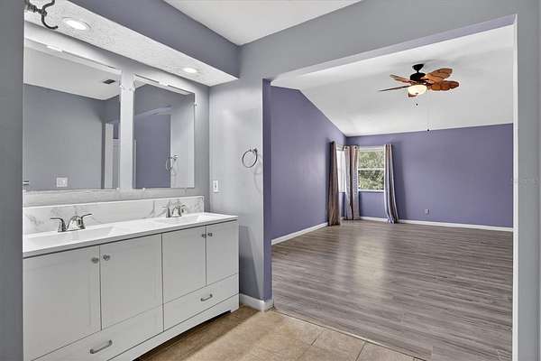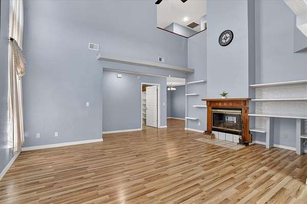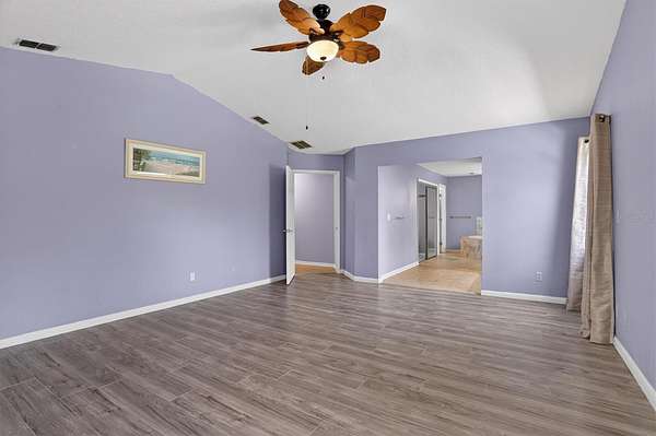 - Ceiling Fans(s), Eat-In Kitchen, High Ceilings, Living Room/Dining Room Combo, Open Floorplan, Primary Bedroom Upstairs, Solid Surface Counters, Solid Wood Cabinets, Split Bedroom, Thermostat, Vaulted Ceiling(s), Walk-In Closet(s)