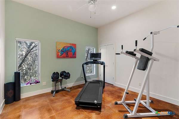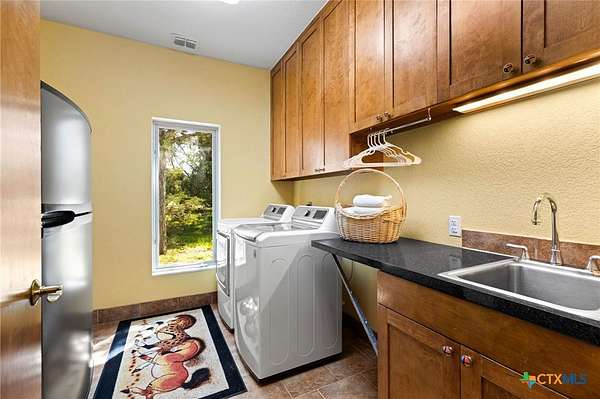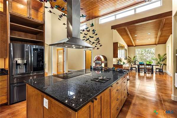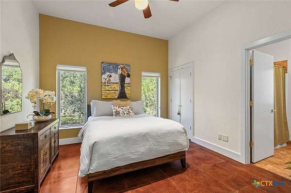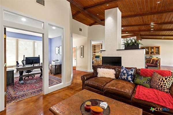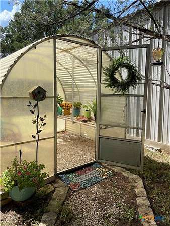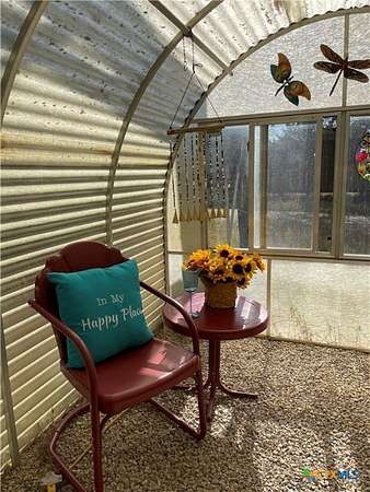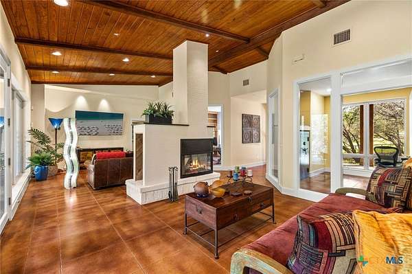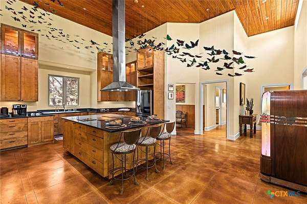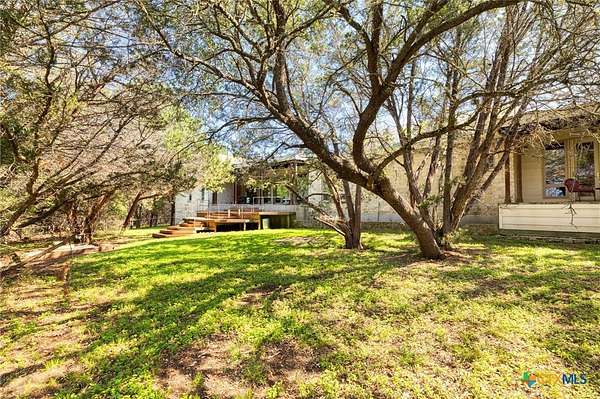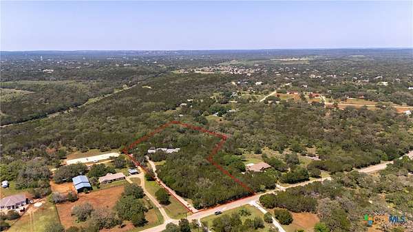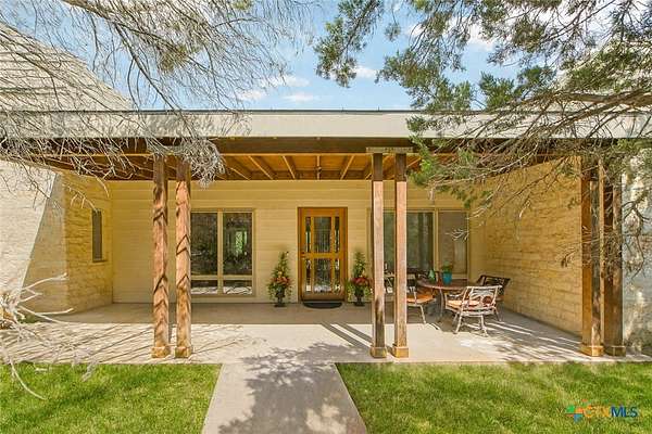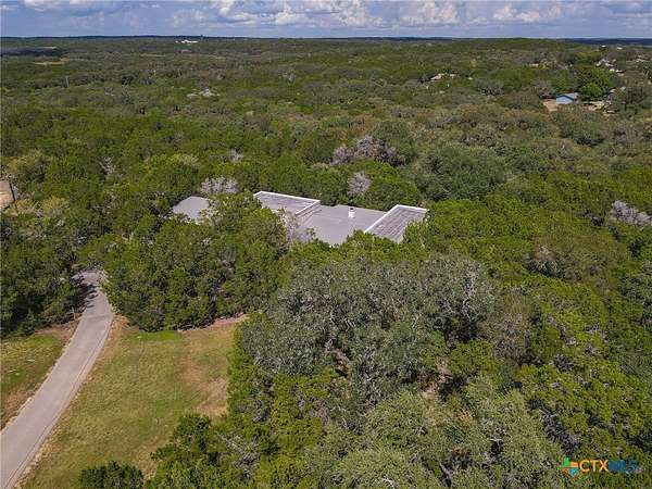 Mariposa House is a one-of-a-kind four-bedroom/four bath 3,721 square foot custom limestone exterior house on 6.87 acres in New Braunfels.Mariposa House is named for its custom butterfly sculpture with hundreds of butterflies suspended from the 20-foot kitchen ceiling.The centerpiece of this extraordinary home is its vast living area, with vaulted wood ceilings,& a wall of windows providing a spectacular view.Custom three-dimensional stucco woodburning fireplace adds warm charm to the open living space.His&her offices with floor-to-ceiling windows open onto the living area, perfect for remote work. Generous U-shape kitchen includes an enormous Island with a Black Pearl granite countertop, stacked Upper Cabinets w/ Glass Fronts & Lighting (52" Uppers),LG Refrigerator Conveys (French Door), Dacor 5 burner electric cooktop complete with an industrial vent soaring to the kitchen's 20-foot ceiling.Kitchen also features a workstation extra deep kitchen sink, instant hot water spigot, a pantry w/custom built-in wine storage&breakfast bar.Primary bedroom opens onto a private patio facing the forest. The dedicated master bath includes a whirlpool bath and a separate large walk-in shower. His and her closets adjoin master bath. An oversized 80-gallon water heater with circulation pump dedicated to the primary living residence assures an endless supply of hot water.The east wing guest section includes 3 guest rooms with dedicated baths. The east wing comes complete with its own independent heat pump, Nest smart thermostat, and water heater.The 6.87-acre forest includes oak and cedar trees + a seasonal creek. Property is fenced &cross fenced.Huge 3 car carport is built to enclose if you desire,a one car oversize garage, storage building, green house + a 200-yard paved drive that takes you to your castle that cannot be seen from the road or neighbors' house.See uploaded virtual tour, metaport and attached features lists for a complete tour & feel of this exceptional way of life.