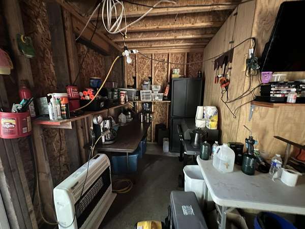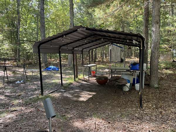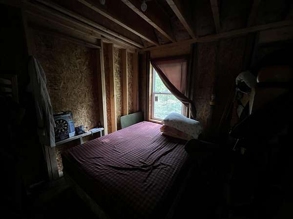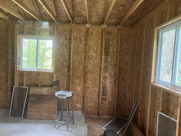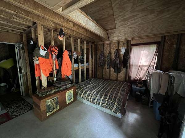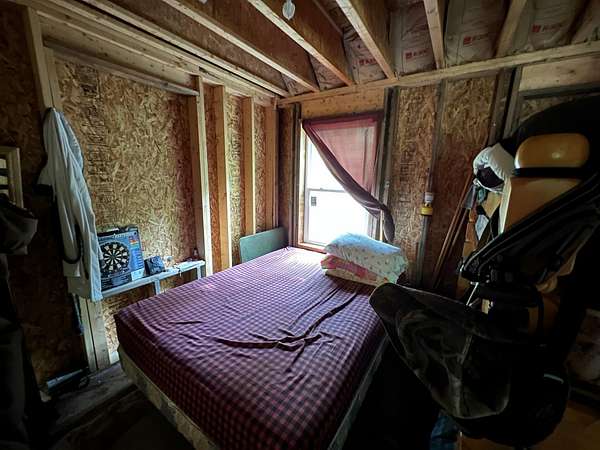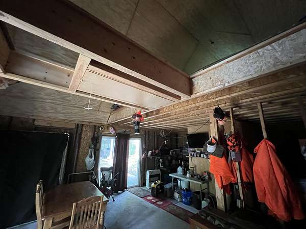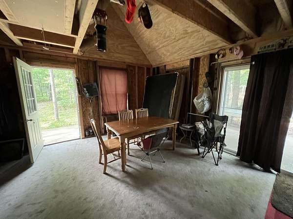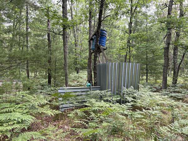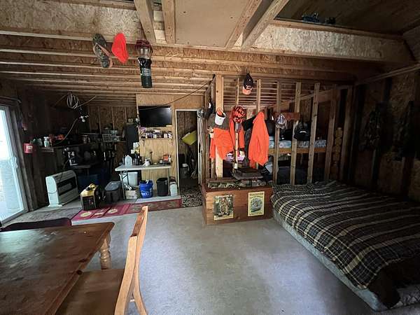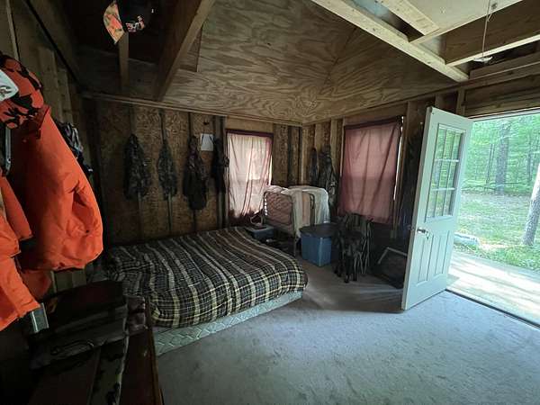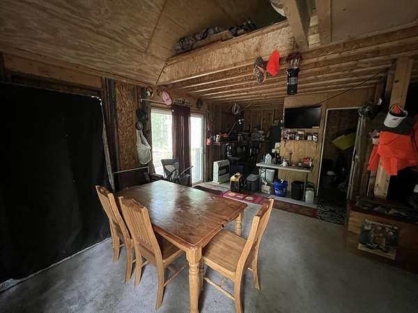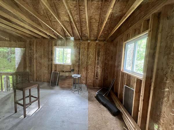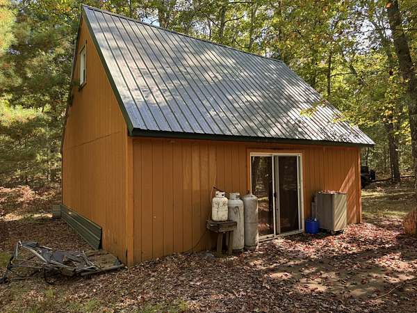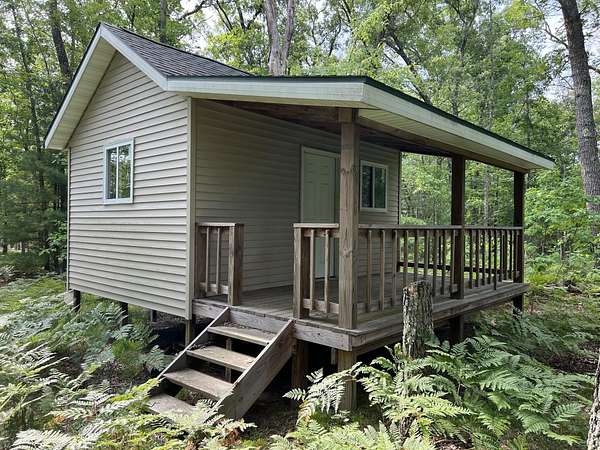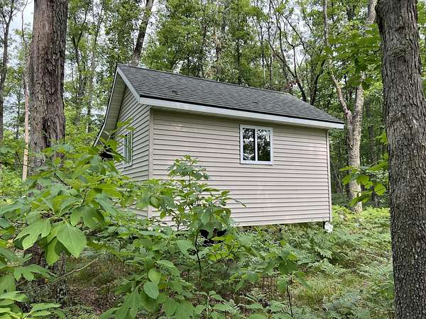 19.48 Acres - Discover your own private oasis in this rustic cabin nestled deep in the woods. This off-grid chalet-style retreat offers endless possibilities for the ultimate Up North escape. With designated areas for a kitchen, bath, bedroom, loft, and additional sleeping spaces, this blank canvas is ready for your personal touch. Outside, a charming pavilion invites relaxation and entertaining, while multiple sheds provide ample storage. Immerse yourself in nature with vast wooded acreage bordering hundreds of acres of Federal Land. Your adventure awaits! A permit is required from Lake County Building Department to finish the home.