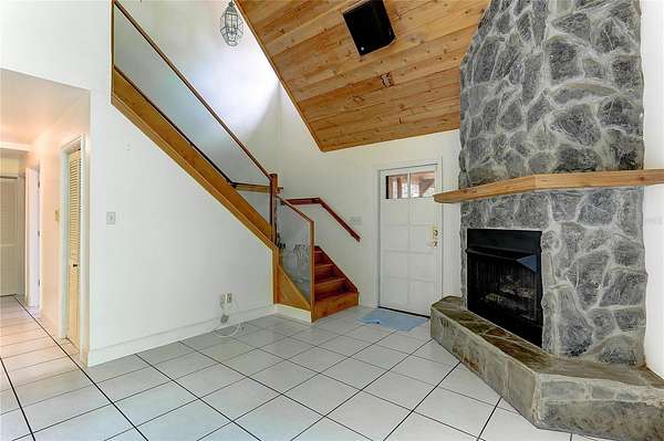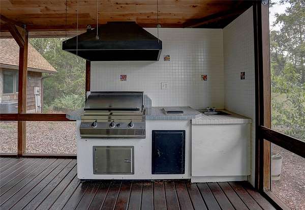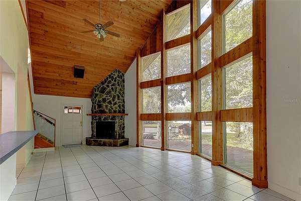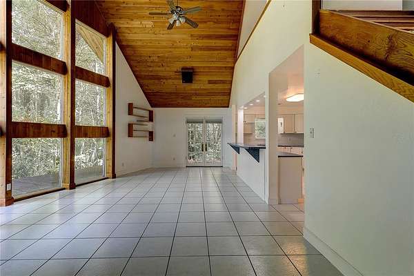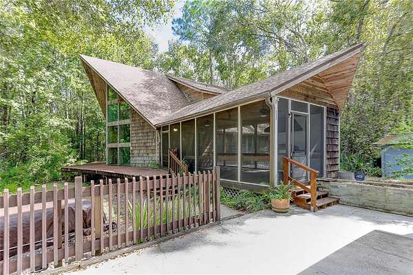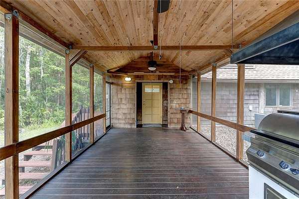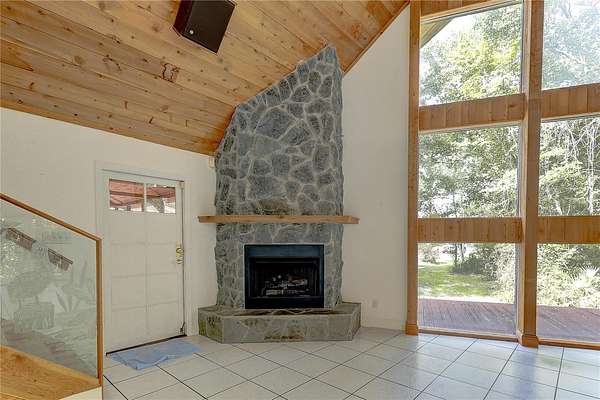 The main residence is a custom-built chalet-style cedar home showcasing dramatic glassed prows and exceptional craftsmanship, constructed in 1998. It offers 1,645 square feet of living area with three bedrooms and two baths. The first floor features a spacious great room, kitchen, two bedrooms, and one bath, while the second level provides an open loft-style primary bedroom with a walk-in closet and full bath. Architectural highlights include soaring vaulted ceilings finished in tongue-and-groove cedar, a stunning corner stone fireplace, and a wraparound front deck. An attached screened cedar porch with vaulted ceilings and an outdoor kitchen creates the perfect setting for entertaining or relaxing while enjoying the surrounding wildlife. The washer and dryer are conveniently located in a kitchen closet, and the roof was replaced in 2024.