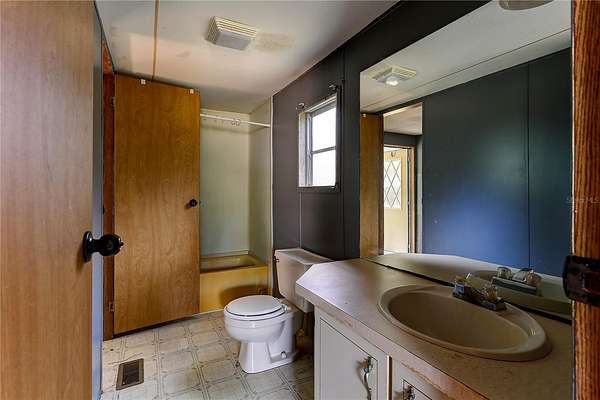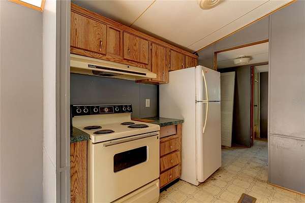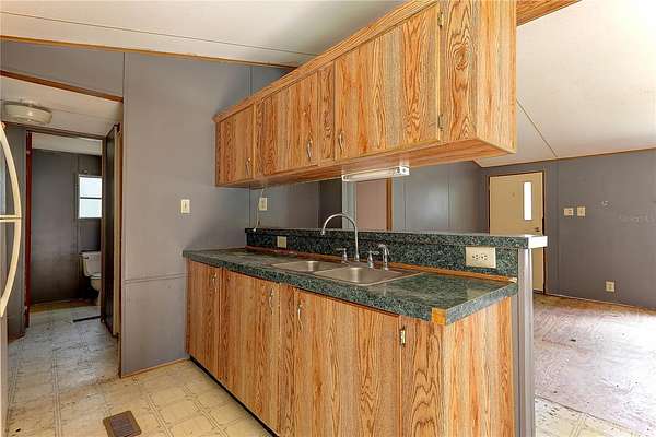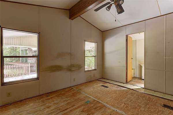 The second home, a 1990 doublewide manufactured home with 960 square feet of living area, includes two bedrooms and two baths. It offers a front open deck and a rear glass-enclosed porch and is ready for renovation.