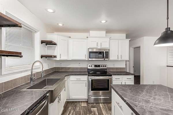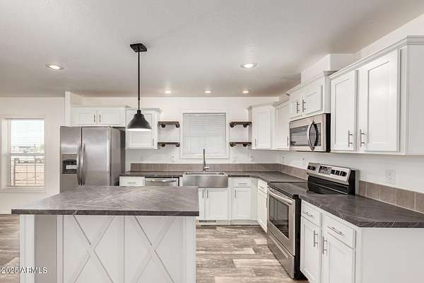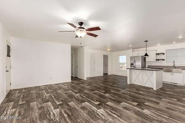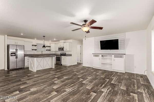 Delightful 3BR manufactured home on over 1.6 acres of land! This property offers abundant parking and lots of landscaping potential. Inside, discover a large & bright open floor plan complemented by soft neutral paint and popular wood-look vinyl floors. The kitchen showcases recessed lighting, staggered white cabinets with crown moulding, contrasting dark counters, stainless steel appliances, a SS single-bowl sink, and an island. All bedrooms have carpet, ceiling fans, and closets. The primary suite hosts a bathroom with a dual sink vanity. Out the back, you'll find a thoughtfully divided fenced backyard; furthermore, the exterior offers a paddock shelter for horses and tons of space to roam. All this is located in a quiet & secluded area with mountain views! What's not to like? Act now!