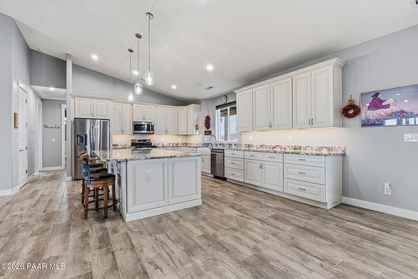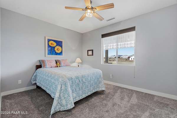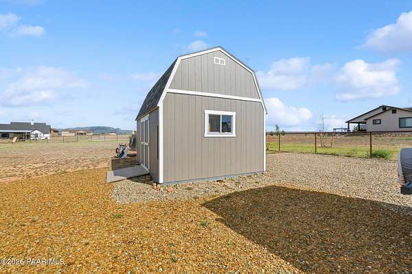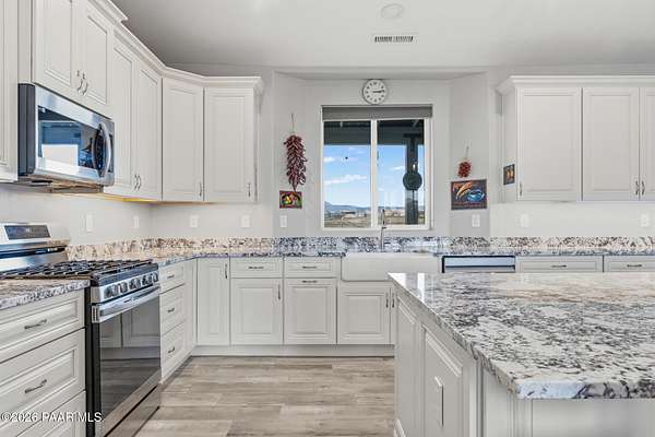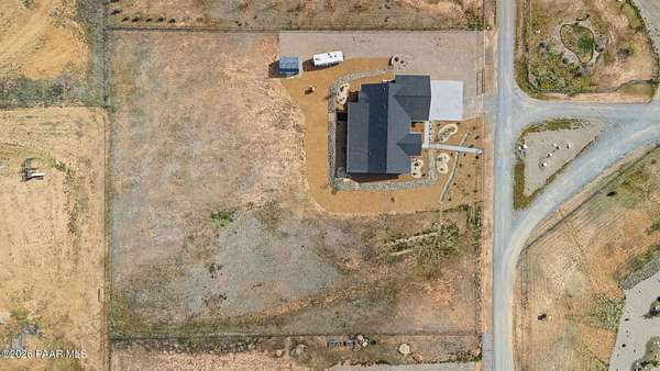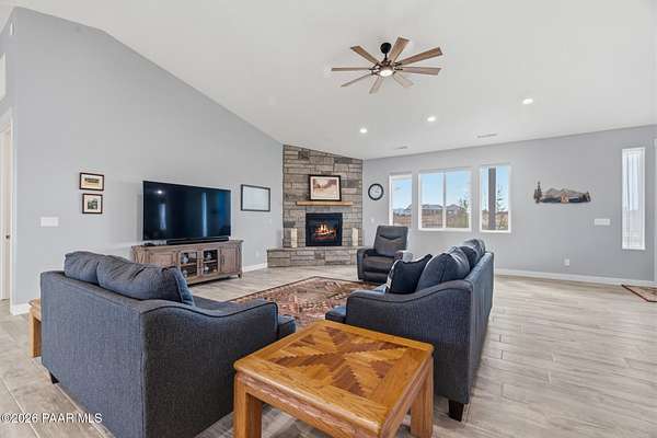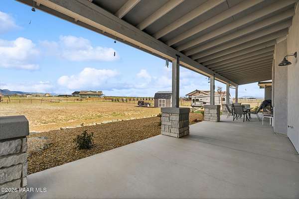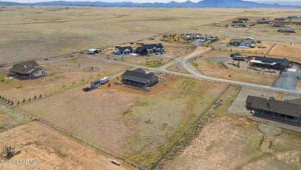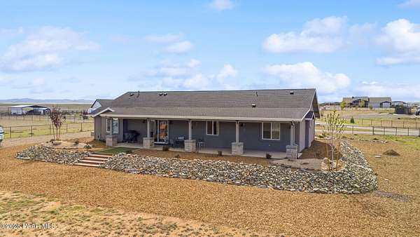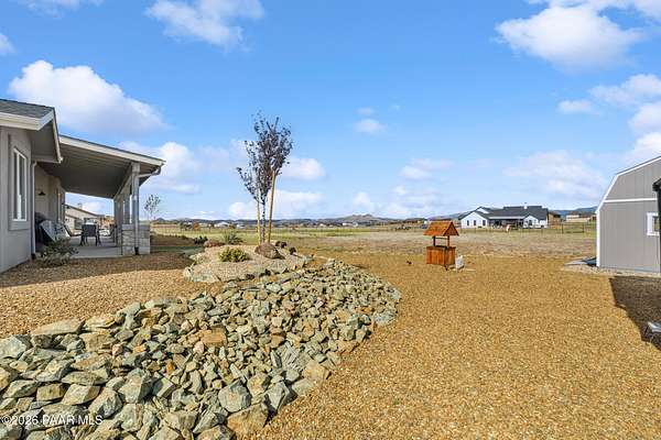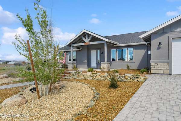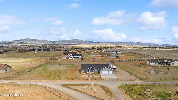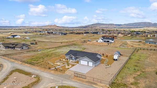 Set on a gently elevated 2.09-acre homesite, this 2023-built single-level home captures breathtaking, unobstructed views of Mingus Mountain, Glassford Hill, Granite Mountain, and the Bradshaw Mountain Range--an ideal setting for buyers seeking space, privacy, and scenic beauty. A gated entry, full perimeter fencing, and thoughtfully designed landscaping create an impressive first impression, while the wide 40-foot entry gate and expansive driveway provide both convenience and flexibility. The three-car garage includes insulated doors, Wi-Fi-enabled openers, and additional room currently configured as a workshop area--perfect for hobbies, storage, or projects.Inside, the home welcomes you with an open, airy great room where soaring vaulted ceilings and wood-grain plank tile flooring create a warm yet modern feel. A striking floor-to-ceiling stack-stone gas fireplace anchors the space, seamlessly connecting the living, dining, and kitchen areas--ideal for both everyday living and entertaining.The kitchen is beautifully appointed with antique white cabinetry, crown molding, soft-close doors and drawers, and under-cabinet lighting that highlights the granite countertops and farmhouse sink. A large center island with pendant lighting, added storage, and a breakfast bar enhances both function and style. Stainless steel appliances--including a gas range with convection oven, built-in microwave, and refrigerator--complete this thoughtfully designed space.The primary suite offers a peaceful retreat filled with natural light, along with a spa-inspired bathroom featuring dual raised-height granite vanities and a stunning floor-to-ceiling tiled walk-in shower. With four bedrooms and three bathrooms in total, the home provides flexibility for guests or multigenerational living. One guest bath offers a full setup with a flawless shower tub combo, while the other features a beautifully tiled walk-in shower, raised granite vanity, and refined finishes. The well-equipped laundry room includes upper and lower cabinetry, granite counters, and direct access to the garage for added convenience.Step outside through the dual-panel glass slider to an expansive covered patio, perfectly positioned to take in the sweeping views and unforgettable Arizona sunsets. The backyard is designed for both relaxation and functionality, featuring a landscaped patio area, tiered rock retaining walls, paver steps, decorative rock, and a storage shed. There's also ample space for RV parking and all your outdoor needs.Additional highlights include a tankless water heater for improved energy efficiency, making this home a perfect blend of modern comfort, quality craftsmanship, and wide-open Arizona living.