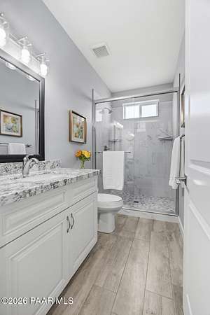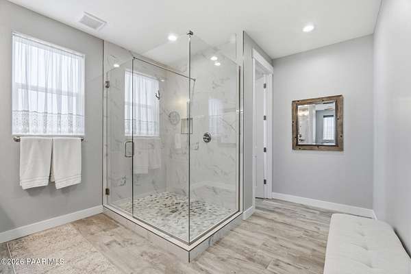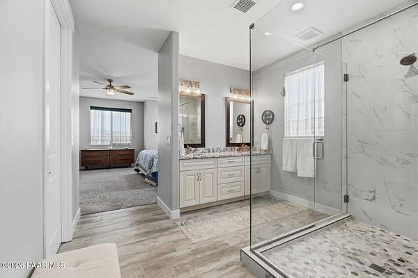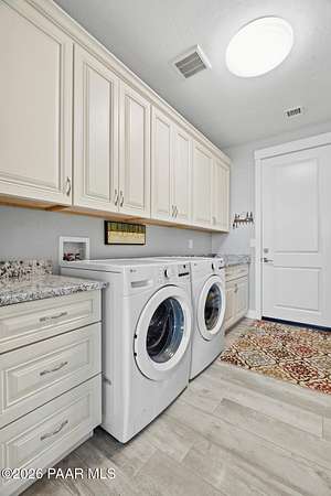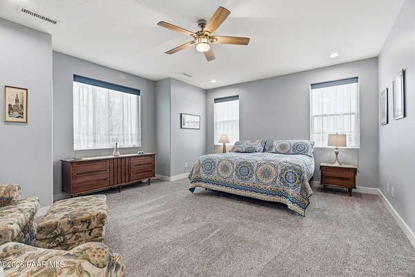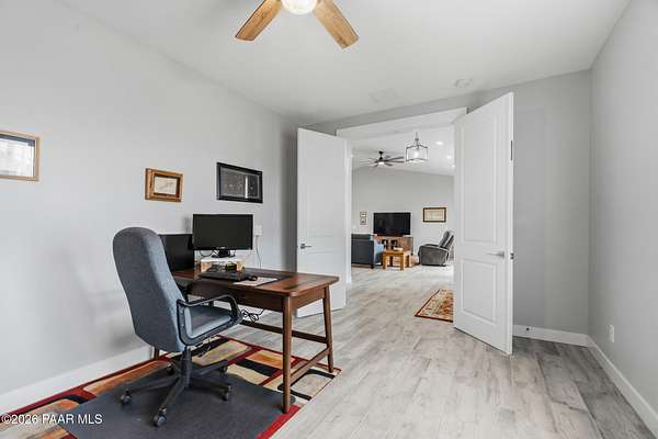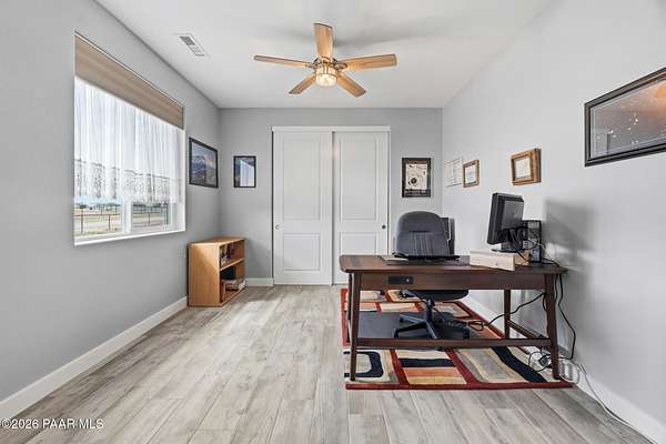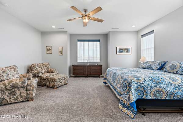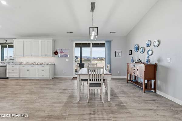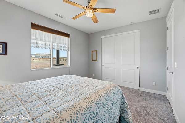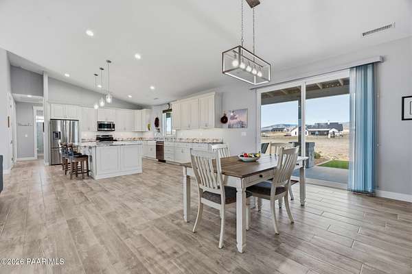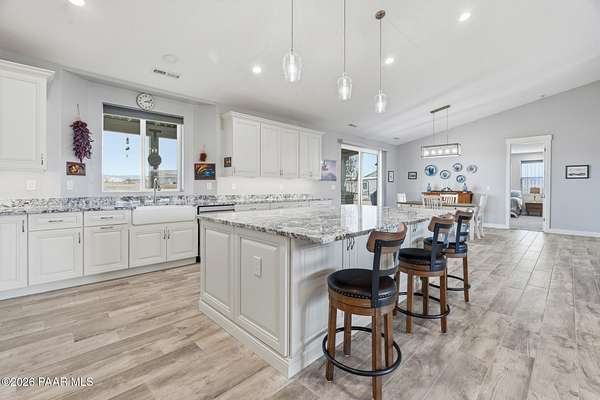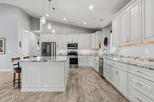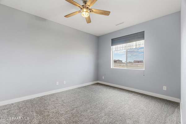 Set on a gently elevated 2.09-acre homesite, this 2023-built single-level home captures breathtaking, unobstructed views of Mingus Mountain, Glassford Hill, Granite Mountain, and the Bradshaw Mountain Range--an ideal setting for buyers seeking space, privacy, and scenic beauty. A gated entry, full perimeter fencing, and thoughtfully designed landscaping create an impressive first impression, while the wide 40-foot entry gate and expansive driveway provide both convenience and flexibility. The three-car garage includes insulated doors, Wi-Fi-enabled openers, and additional room currently configured as a workshop area--perfect for hobbies, storage, or projects.Inside, the home welcomes you with an open, airy great room where soaring vaulted ceilings and wood-grain plank tile flooring create a warm yet modern feel. A striking floor-to-ceiling stack-stone gas fireplace anchors the space, seamlessly connecting the living, dining, and kitchen areas--ideal for both everyday living and entertaining.The kitchen is beautifully appointed with antique white cabinetry, crown molding, soft-close doors and drawers, and under-cabinet lighting that highlights the granite countertops and farmhouse sink. A large center island with pendant lighting, added storage, and a breakfast bar enhances both function and style. Stainless steel appliances--including a gas range with convection oven, built-in microwave, and refrigerator--complete this thoughtfully designed space.The primary suite offers a peaceful retreat filled with natural light, along with a spa-inspired bathroom featuring dual raised-height granite vanities and a stunning floor-to-ceiling tiled walk-in shower. With four bedrooms and three bathrooms in total, the home provides flexibility for guests or multigenerational living. One guest bath offers a full setup with a flawless shower tub combo, while the other features a beautifully tiled walk-in shower, raised granite vanity, and refined finishes. The well-equipped laundry room includes upper and lower cabinetry, granite counters, and direct access to the garage for added convenience.Step outside through the dual-panel glass slider to an expansive covered patio, perfectly positioned to take in the sweeping views and unforgettable Arizona sunsets. The backyard is designed for both relaxation and functionality, featuring a landscaped patio area, tiered rock retaining walls, paver steps, decorative rock, and a storage shed. There's also ample space for RV parking and all your outdoor needs.Additional highlights include a tankless water heater for improved energy efficiency, making this home a perfect blend of modern comfort, quality craftsmanship, and wide-open Arizona living.